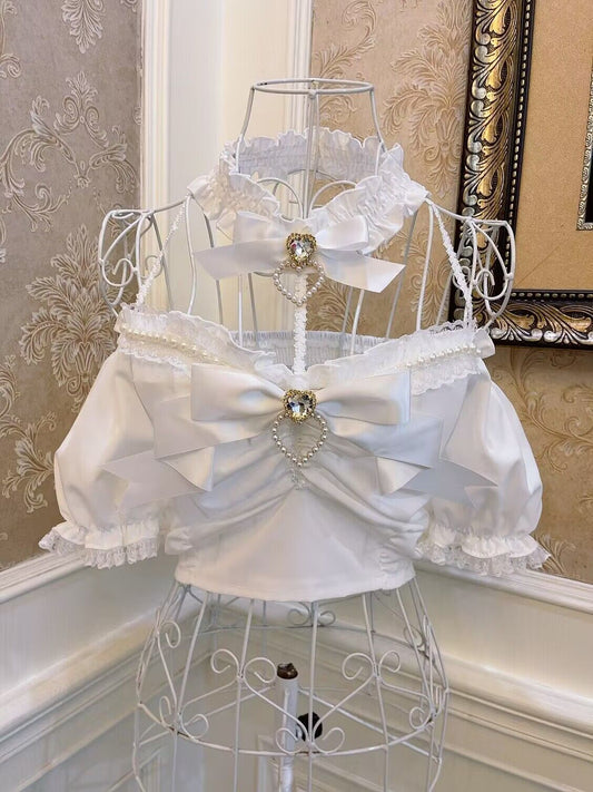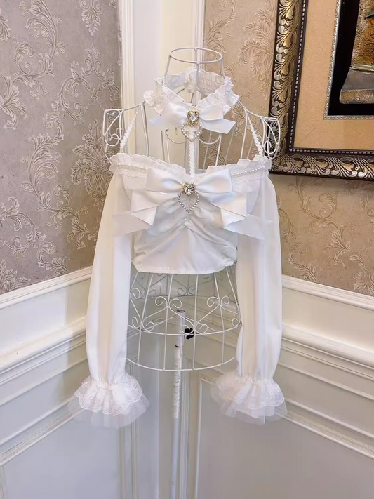 Sweetheart Princess Black White Vintage Coquette Bow Heart Diamond Pearl Lace Bell Sleeves Long Sleeve Shirt Top