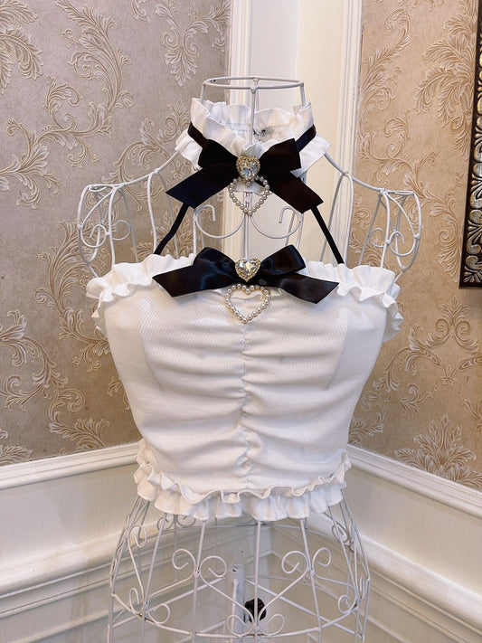 Sweetheart Princess Black & White Brooch Bow Halter Neck Shirt Top