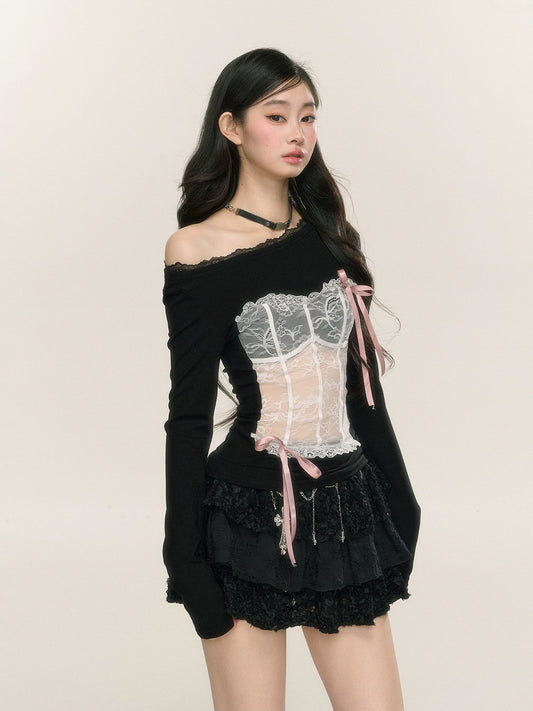 Young Eyes Coquette Square Collar Lace Black Gray White Shirt Top