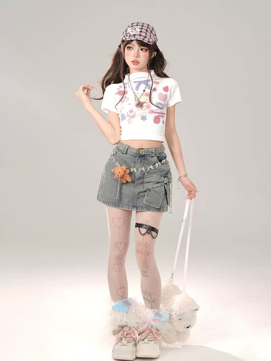 Young Eyes Doll White Pink Knit Kitty Short Sleeve T-shirt Top