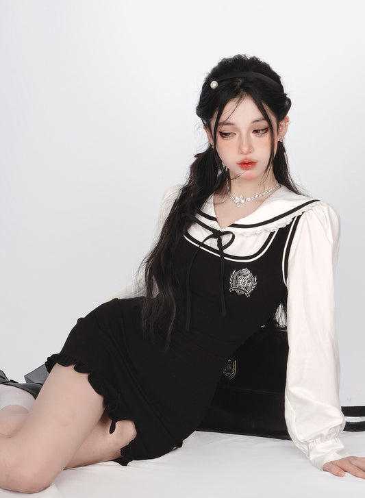Young Eyes First Love Diary White Sailor Collar Shirt & Black Suspender Dress Two Piece Set