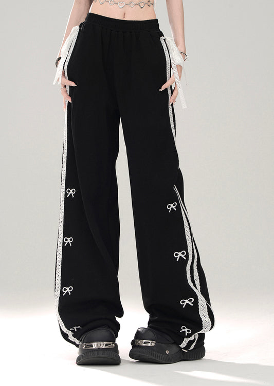 Young Eyes Cozy Bow Lace Black Elastic Waist Gathered Pants