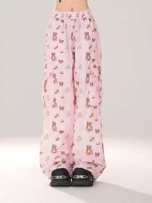 Young Eyes Cute Teddy Bear Pattern White Pink Elastic Waist Gathered Pants