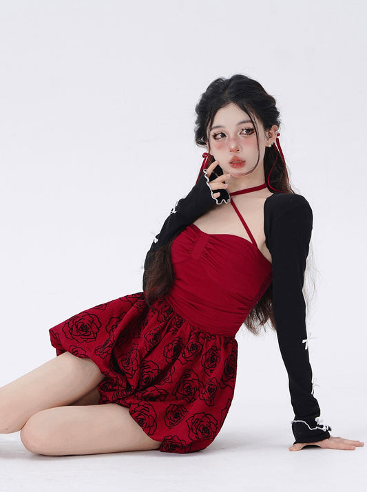 Young Eyes Crimson Red Rose Dress & Balletcore Black Bow Jacket Two Piece Set