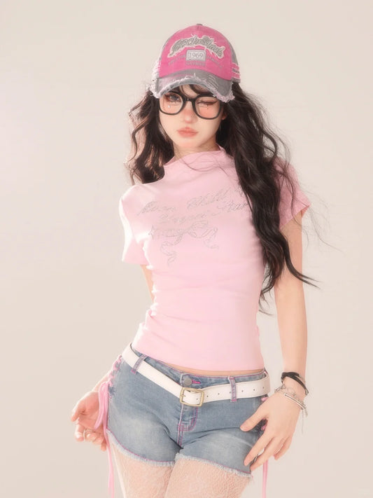 Young Eyes Sexy Summer Girl Blue Denim Pink Ribbon High Waist Jeans Pants Two Piece