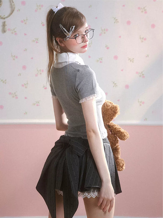 Young Eyes Preppy College School Girl Academia Black & White Shirt Dress Two Piece Set