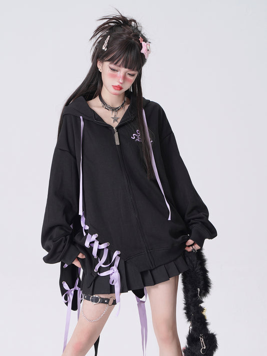 Young Eyes Rabbit Ears Detachable Ribbon Zippered Sweatshirt Hoodie