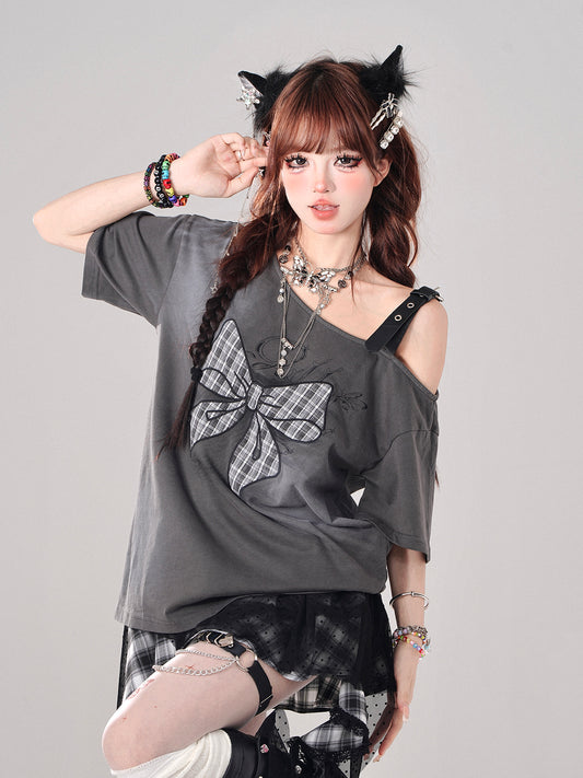 Young Eyes Plaid Bow Gray & White Off Shoulder Oversize Top