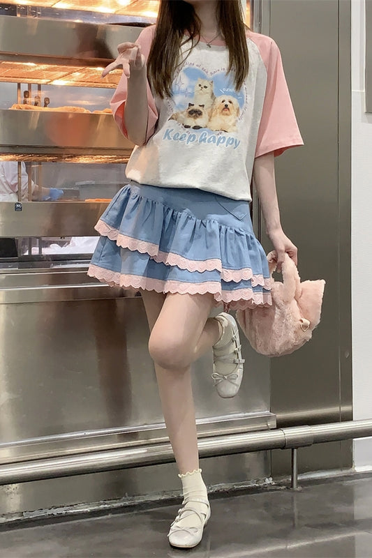 Y2K Sweet Cute Pink & Blue Rim Blue Denim Layered Mini Skirt