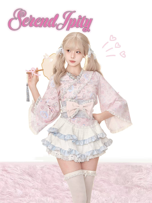 Serendipity Showa Story Pink Kimono Top & Skirt Two Piece Set