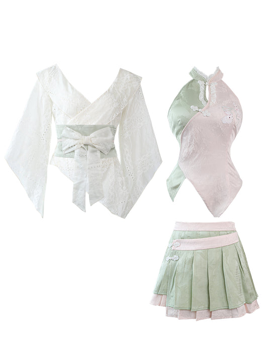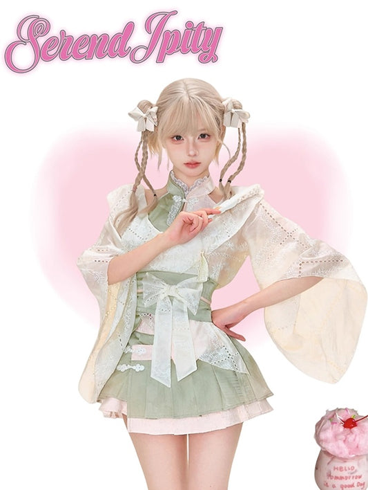 Serendipity Matcha Roll Green Kimono Top Suspender Skirt Cape Three Piece Set