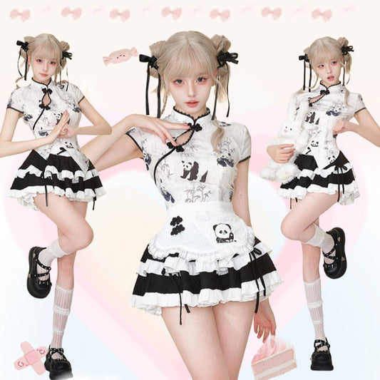 Serendipity Chinese Panda Black White Hanfu Top & Ruffle Skirt Apron Two Piece Set