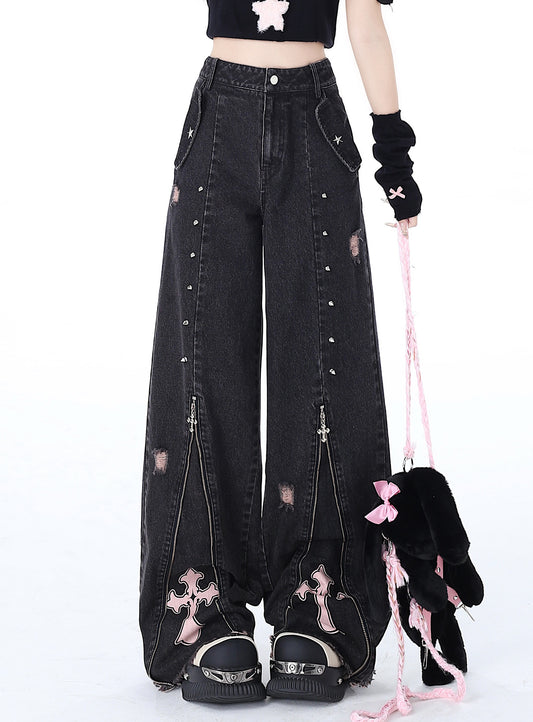 Crazy Girl Dark Heart Black Baggy Ripped Jeans
