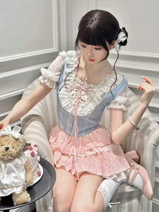 Cream Frost White Blouse Top & Blue Vest & Pink Skirt Three Piece Set