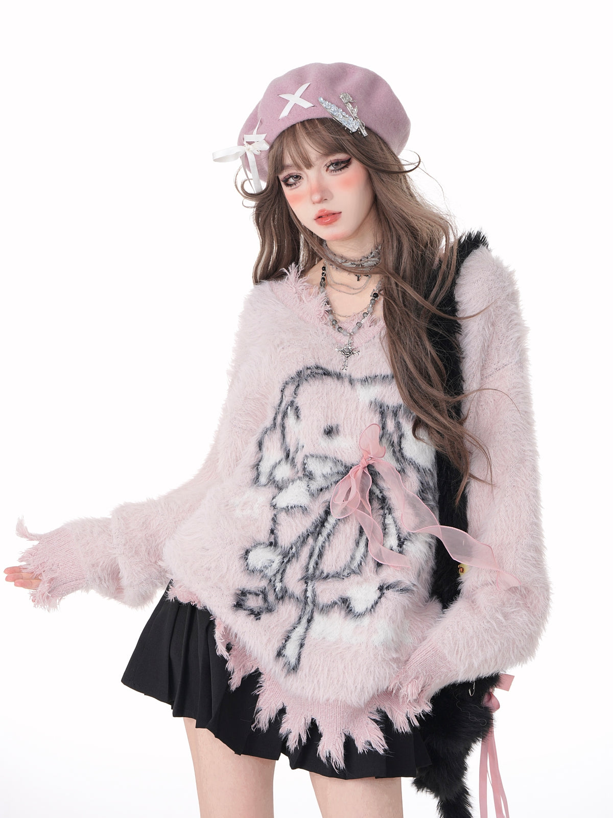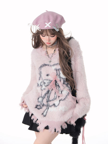 Young Eyes Coquette Rabbit Bow Autumn Winter Faux Fluffy Pink Black Sweater