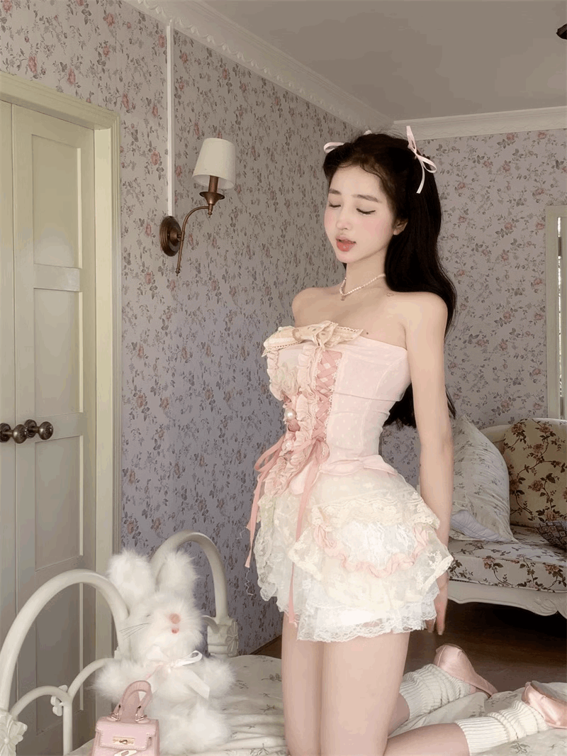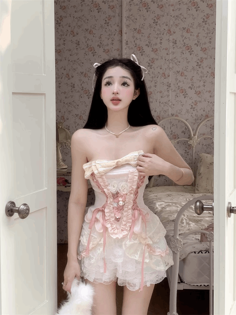 Creamy Cute Coquette Sweet Pink Corset Balletcore Strapless Top & White Shorts Two Piece Set
