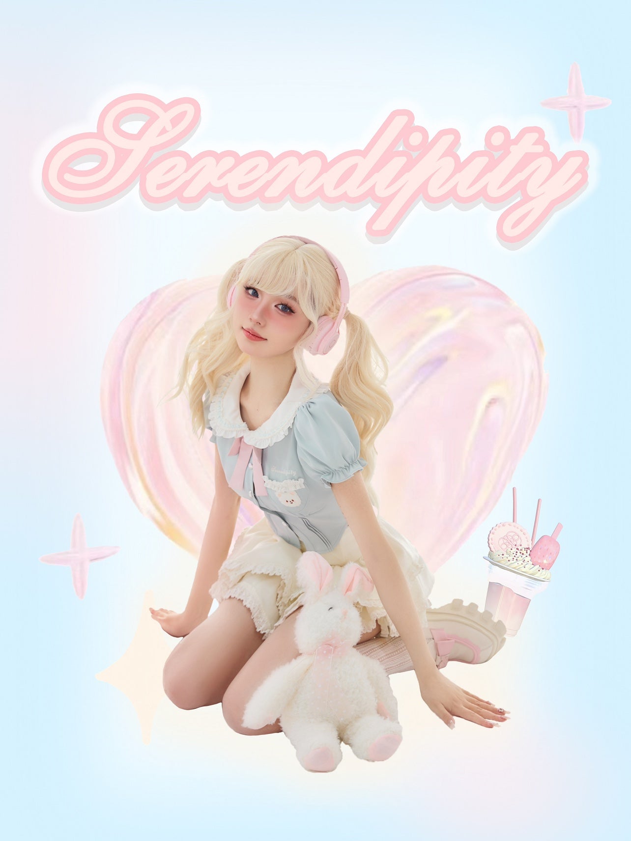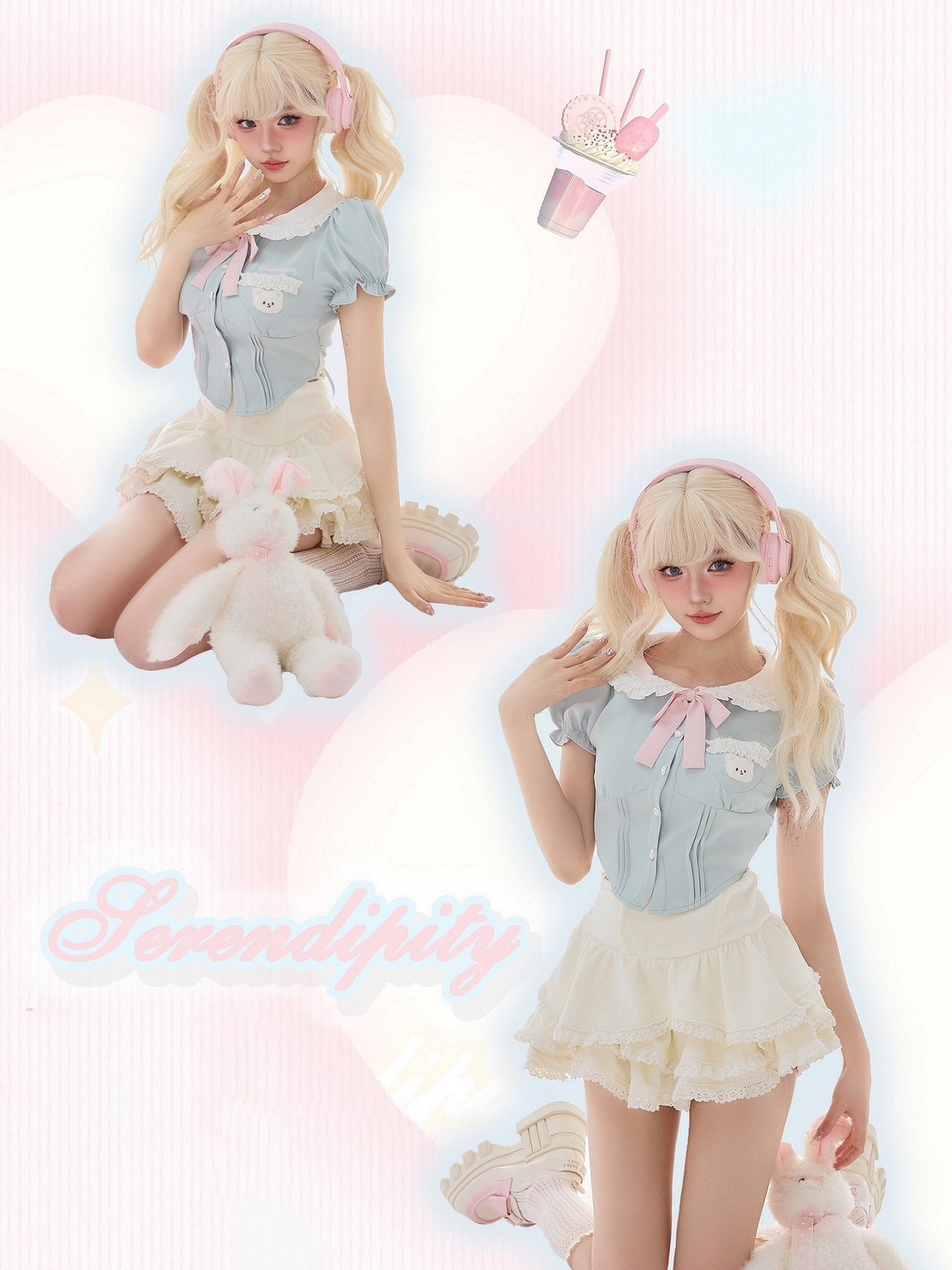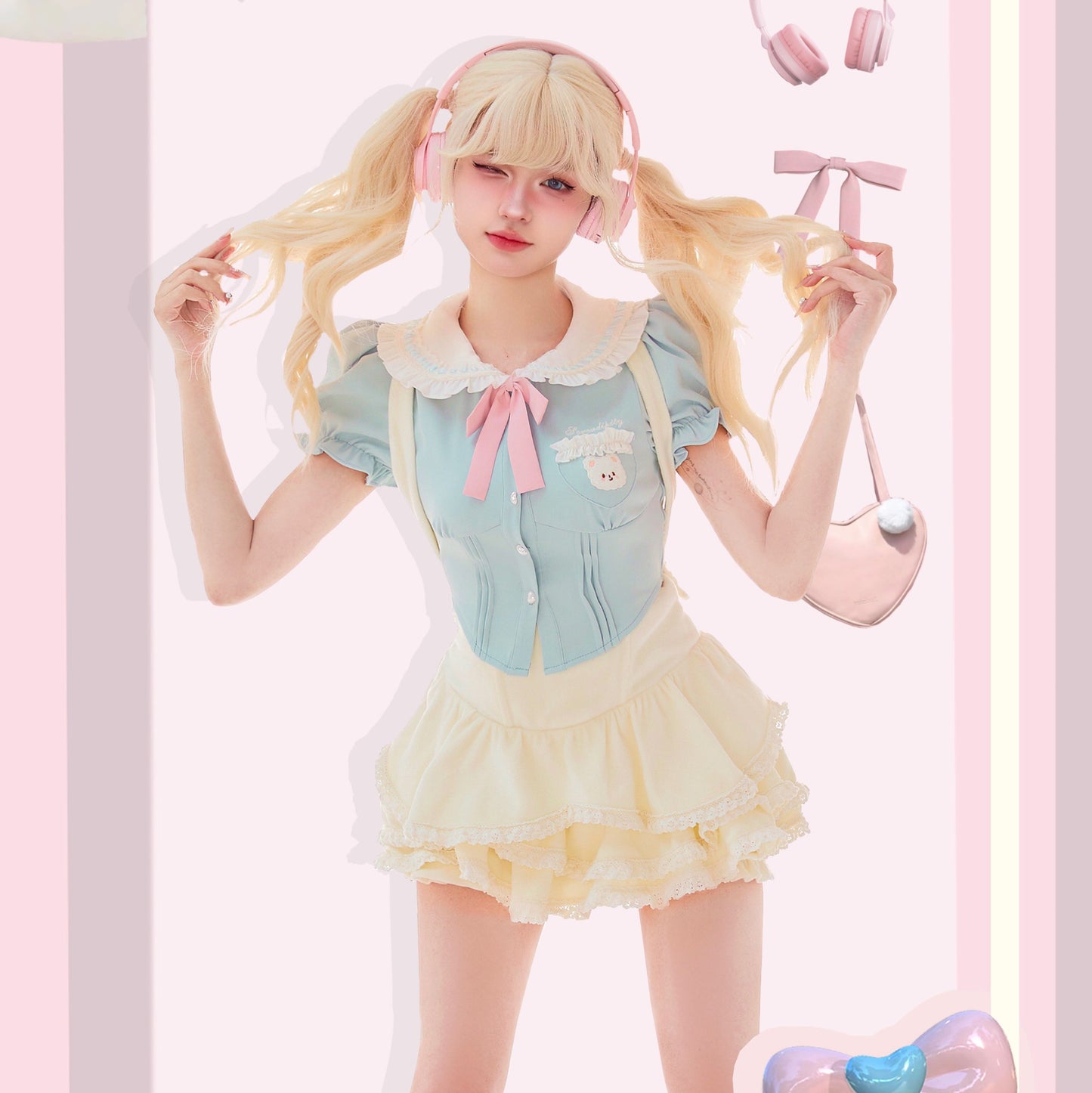 Serendipity Coquette White Doll Collar Bear Blue Puff Sleeve Shirt & White Ruffled Suspender Mini Skirt Two Piece Set