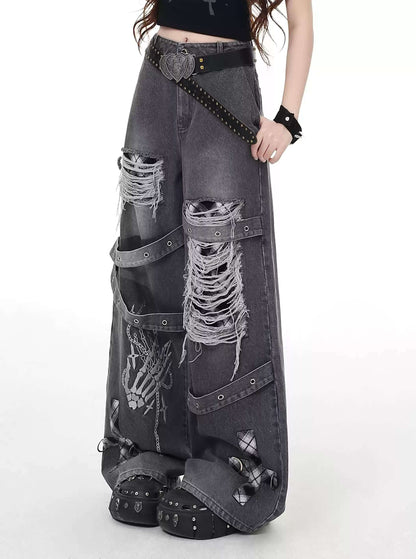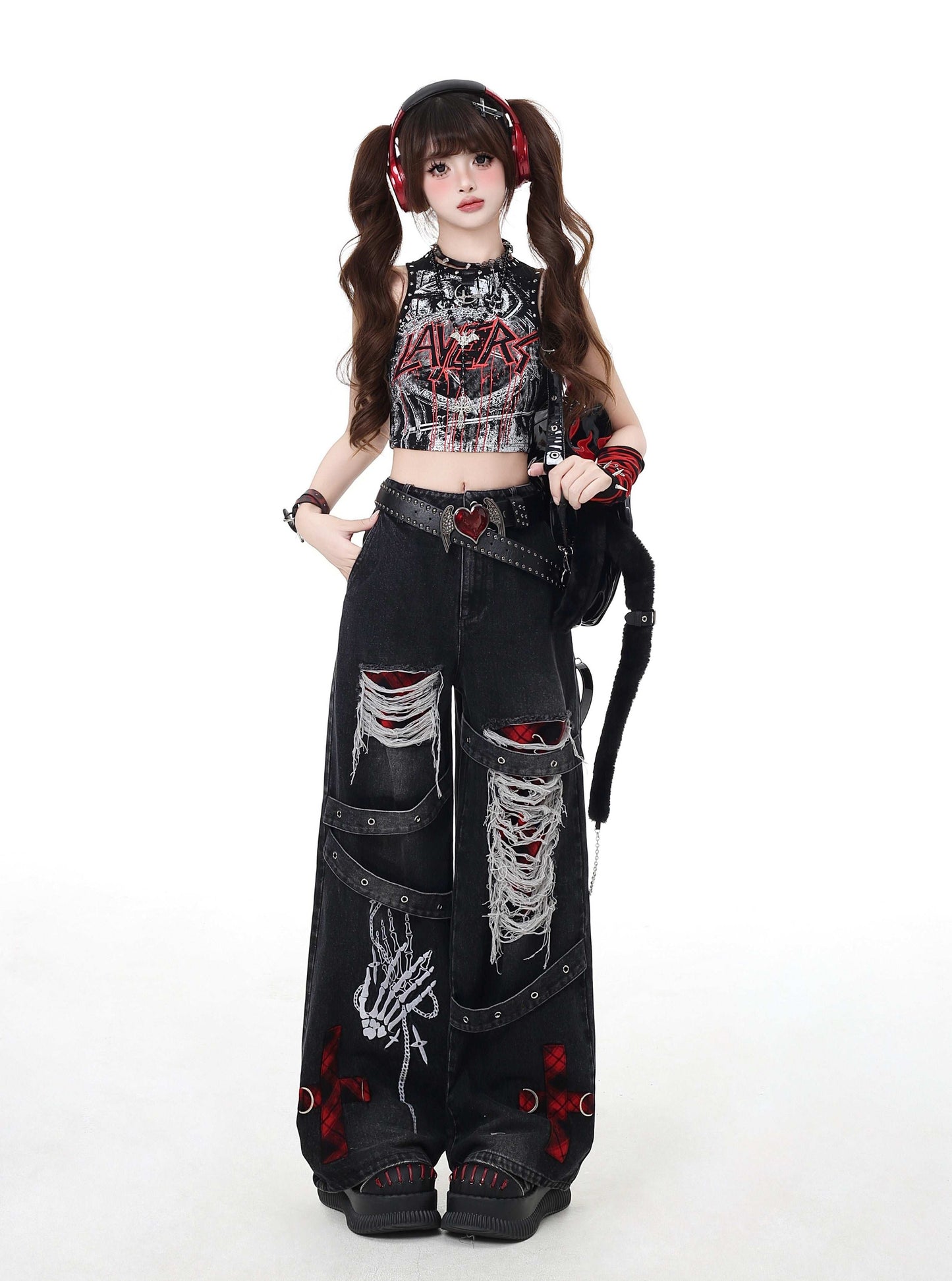 Crazy Girl Concert Escape Black Gray Baggy Ripped Jeans