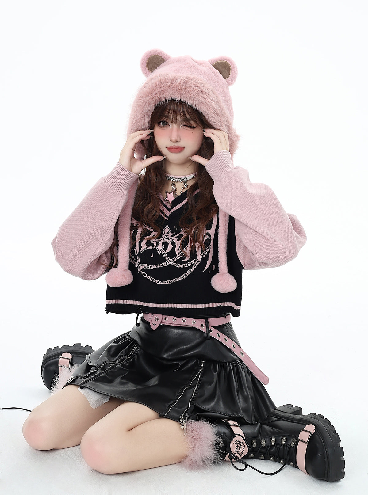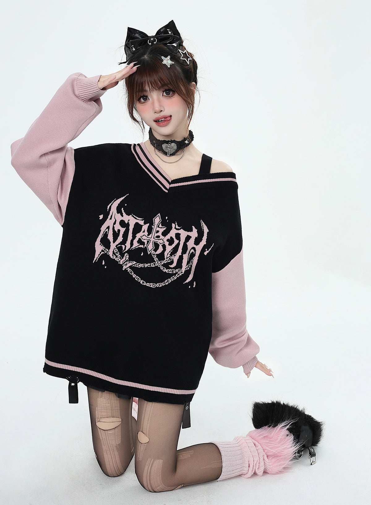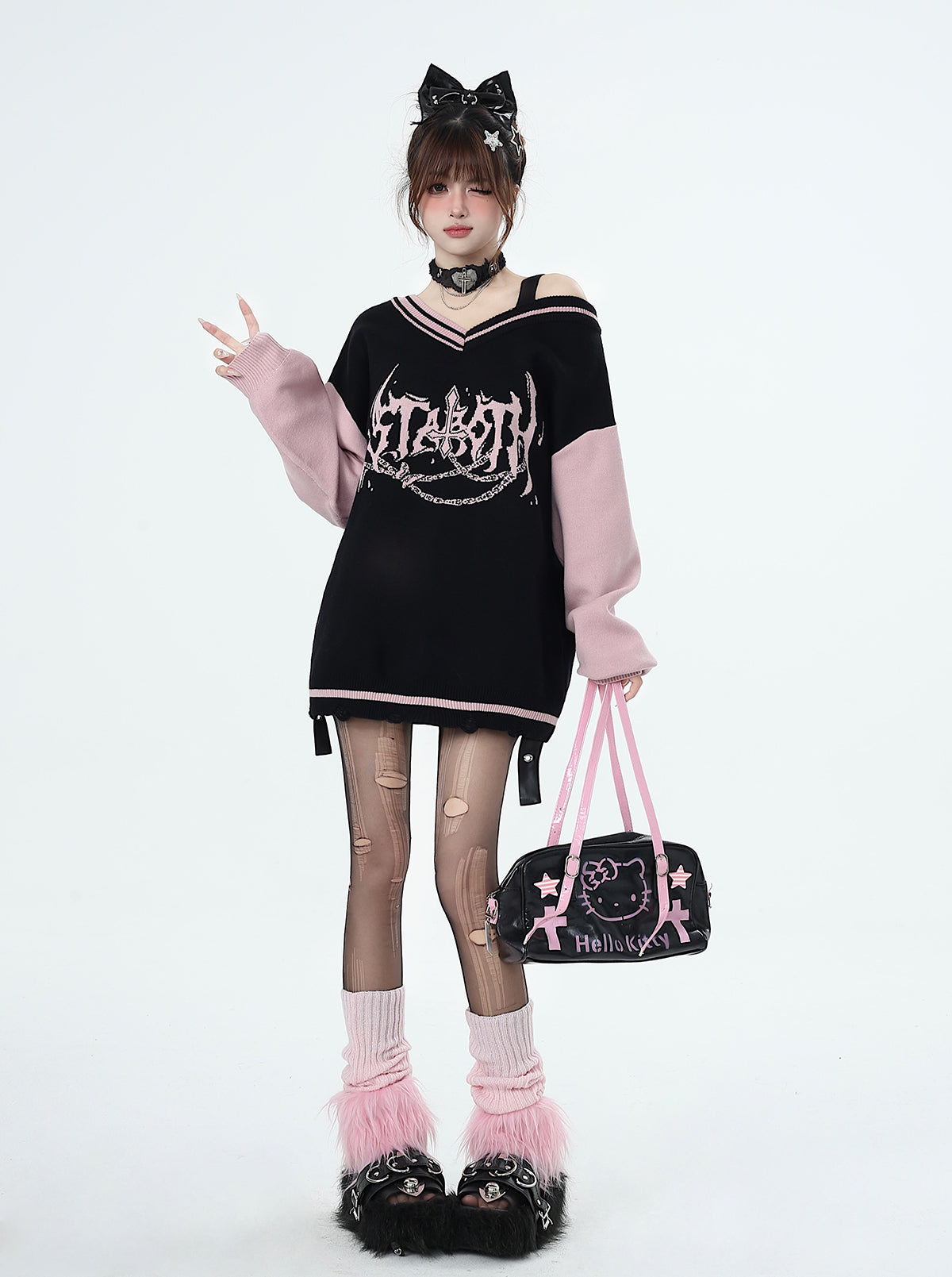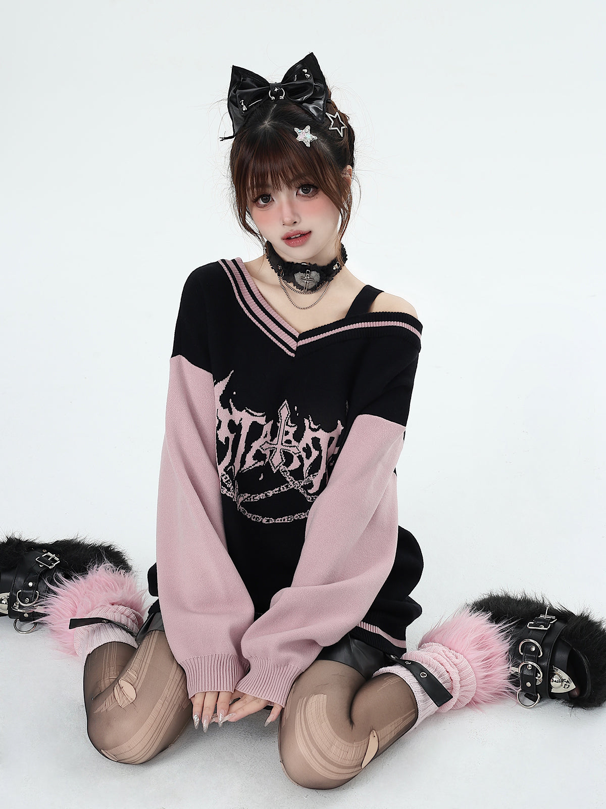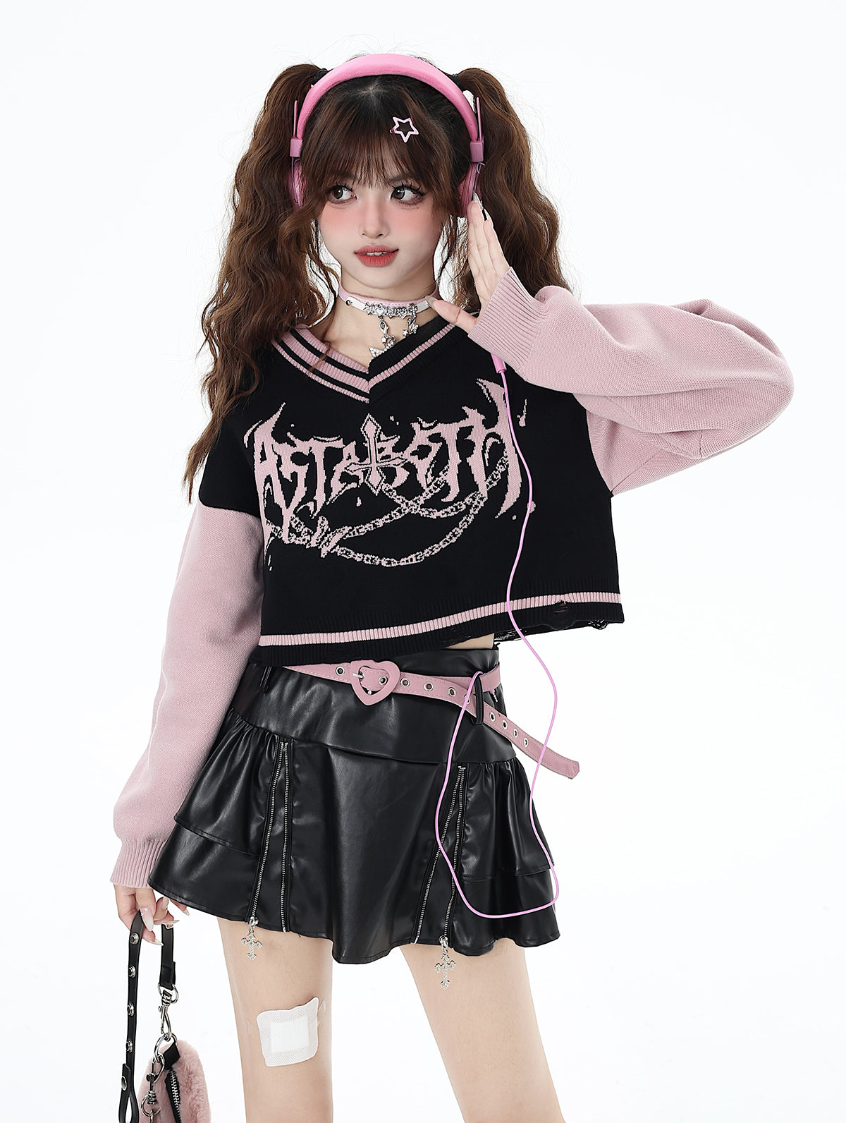Crazy Girl Love Talent Black Pink Punk V Neck Sweater Top