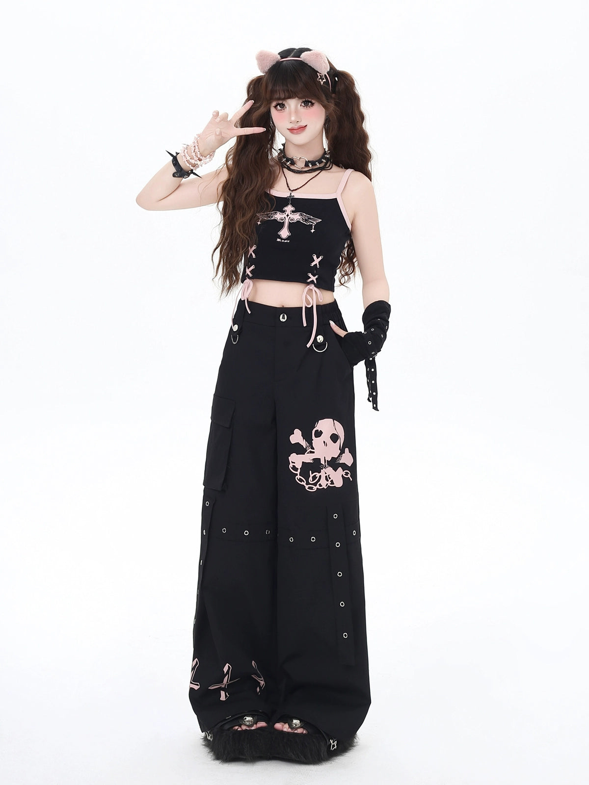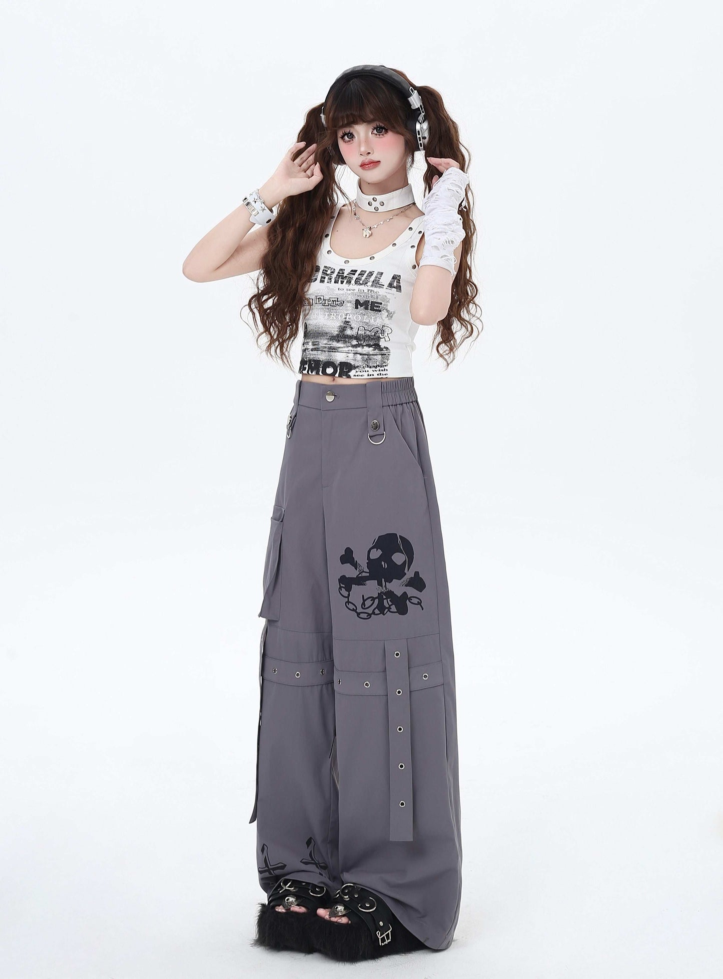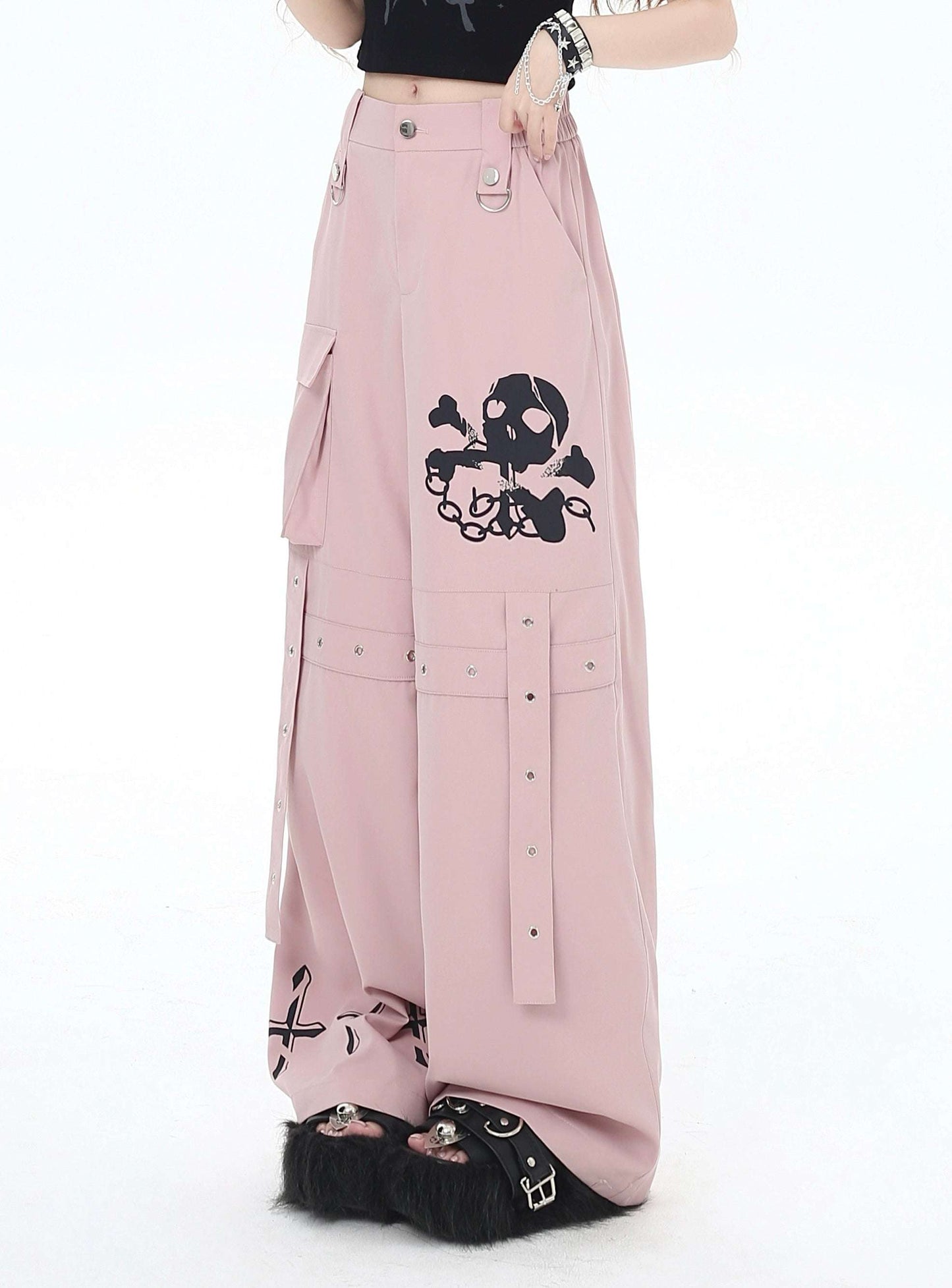 Crazy Girl Skull Workwear Pink Black Gray Baggy Elastic Pants