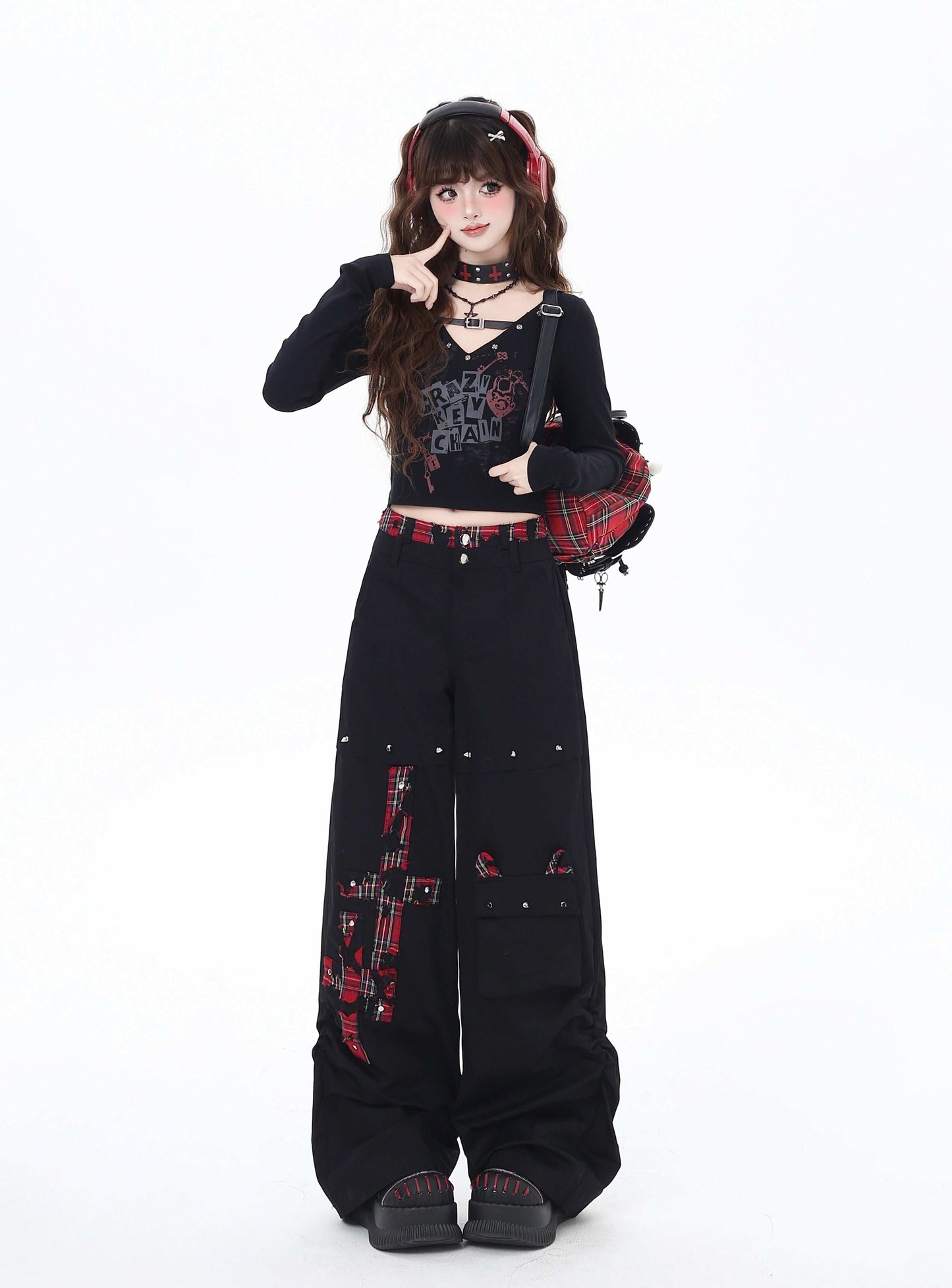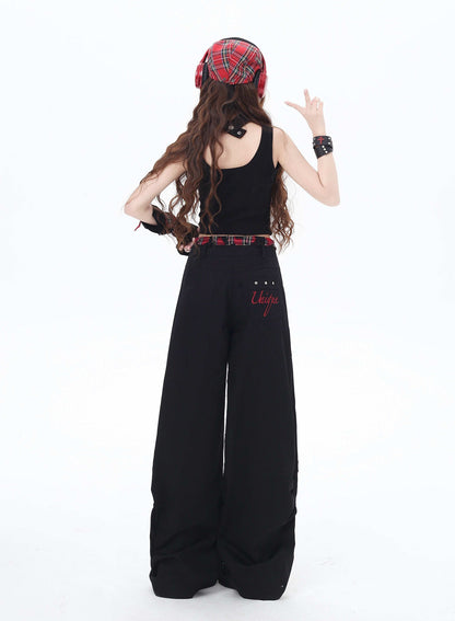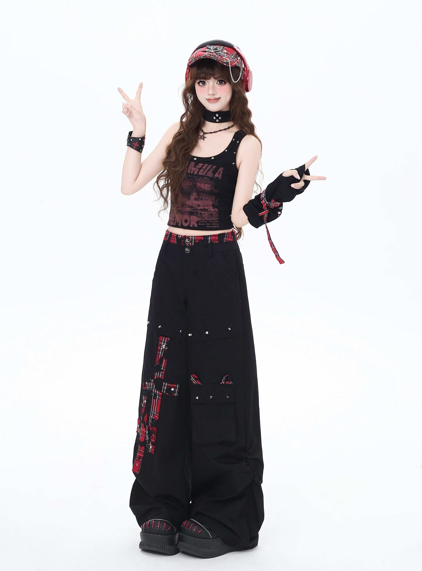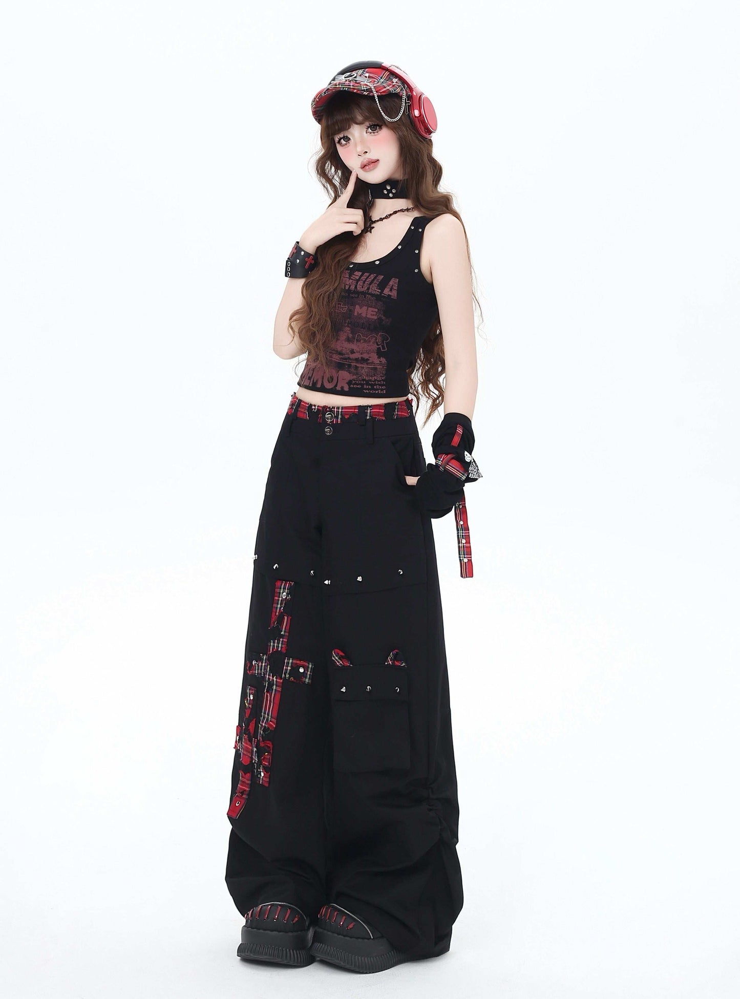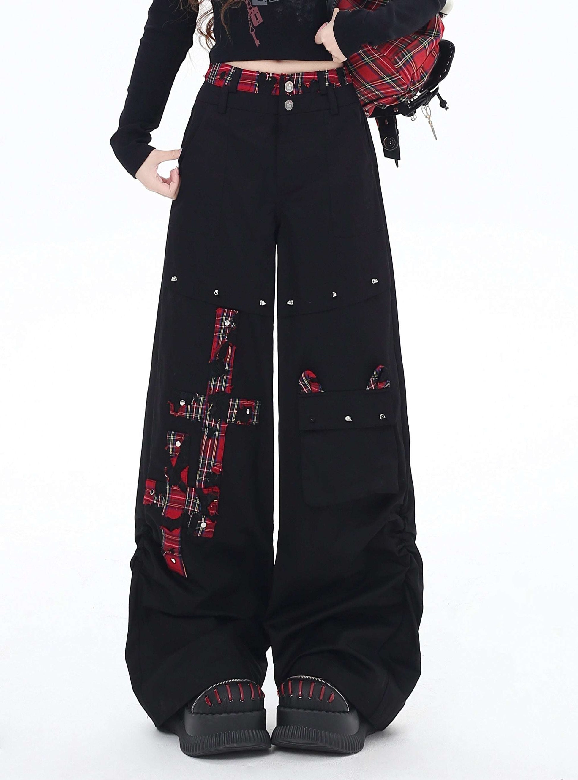 Crazy Girl Vinyl Vibe Plaid Red Black Baggy Pants