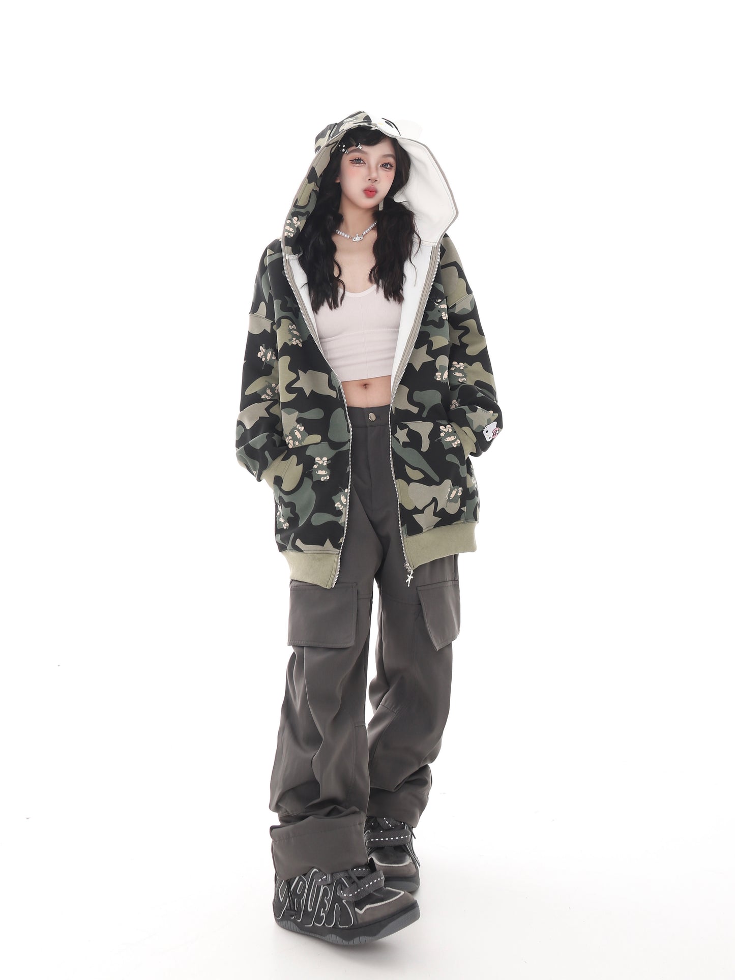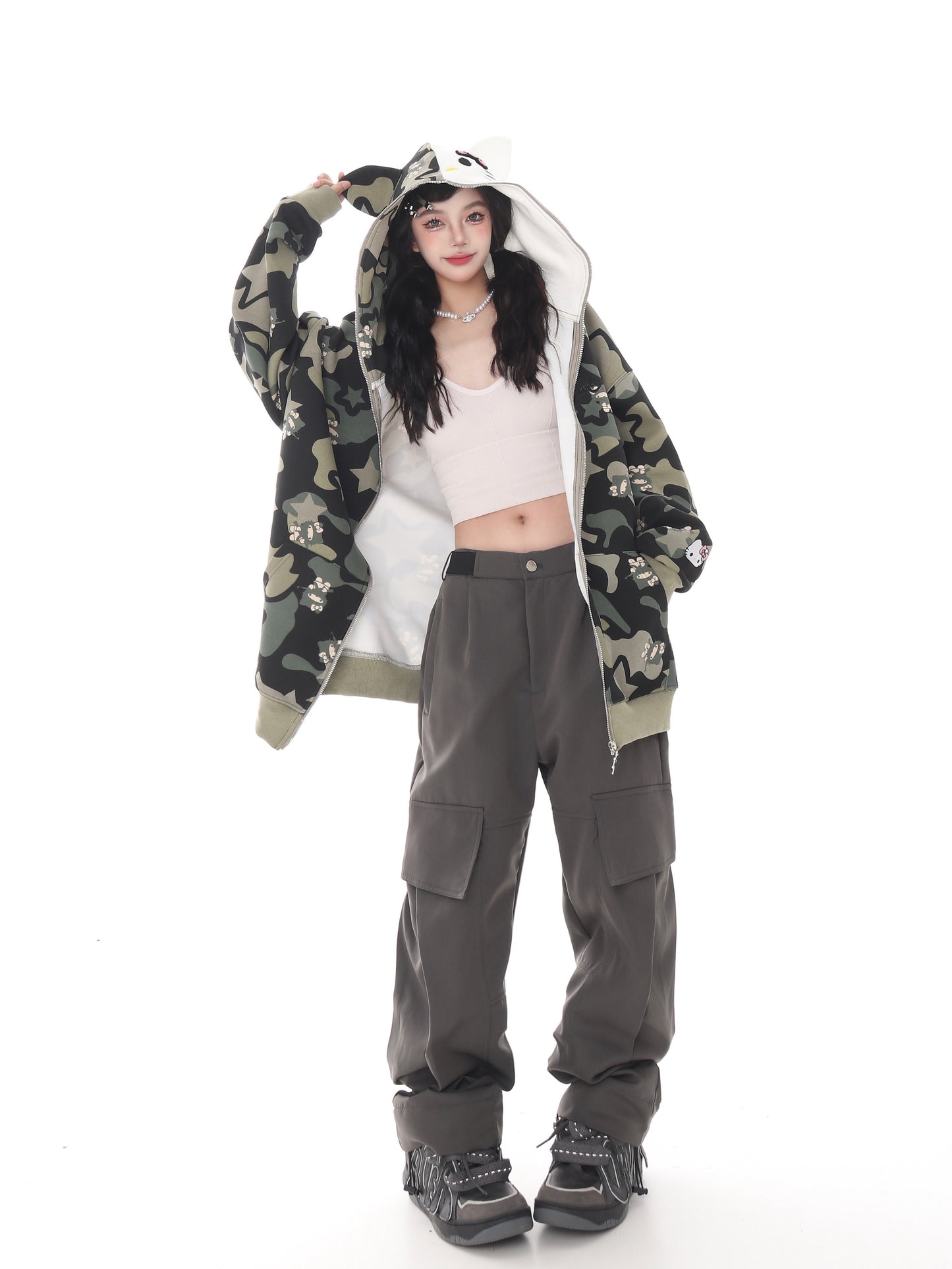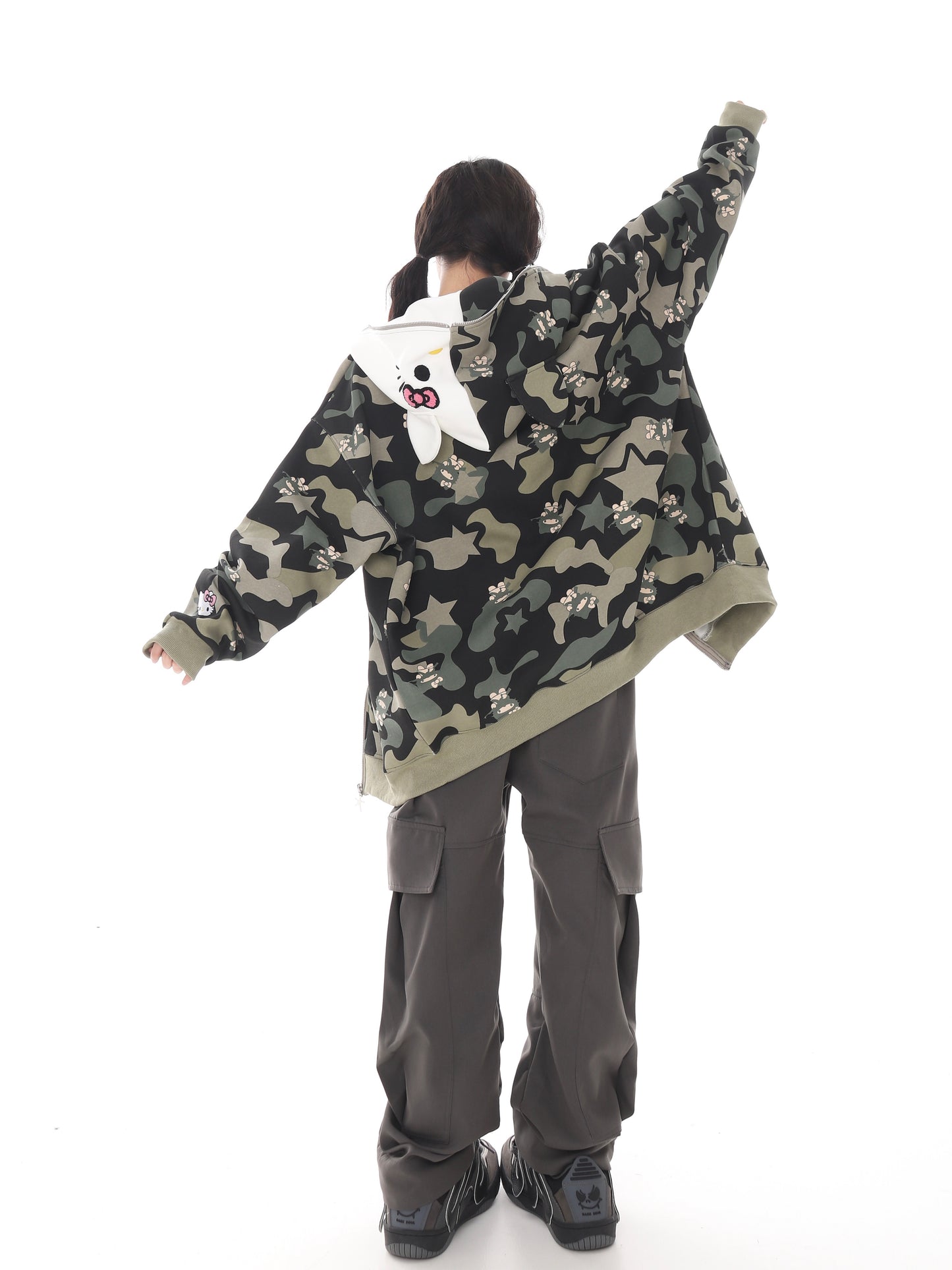 Cute Kitty Cat Print Pink Green Camouflage Y2K Oversize Hoodie Jacket