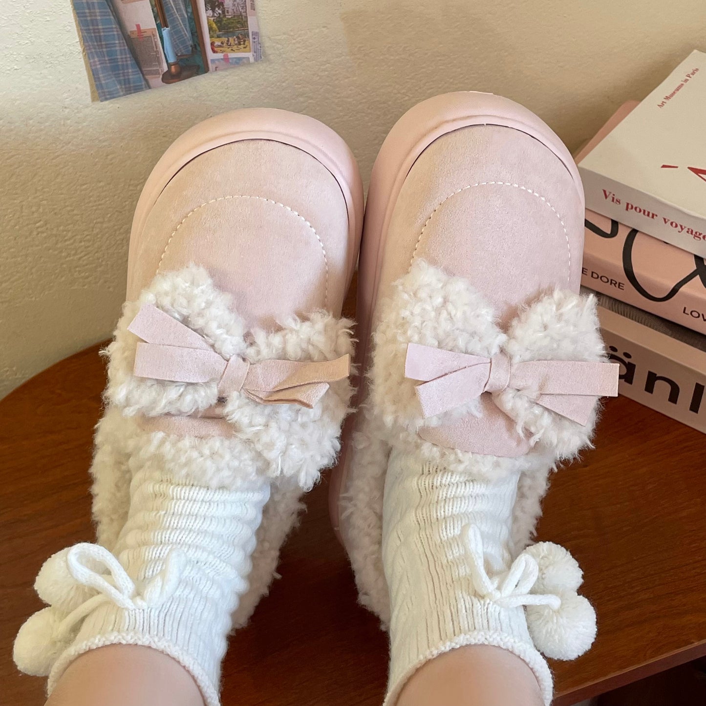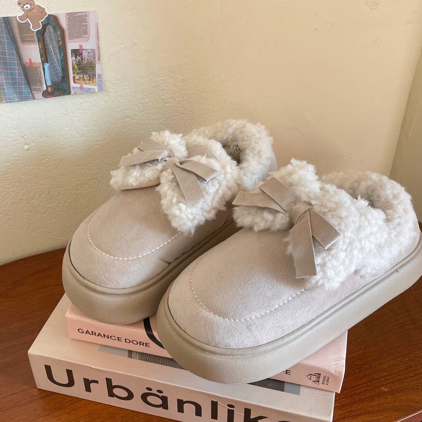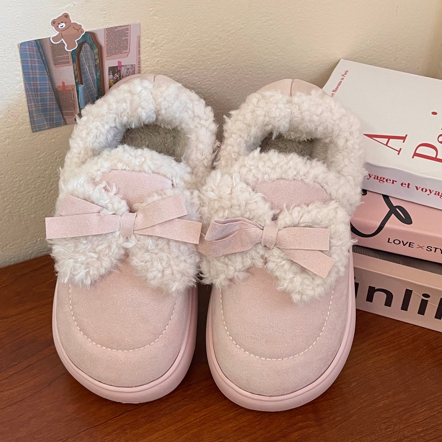 Cute Winter Plush Cotton Bow Pink Blue Khaki Slippers Shoes