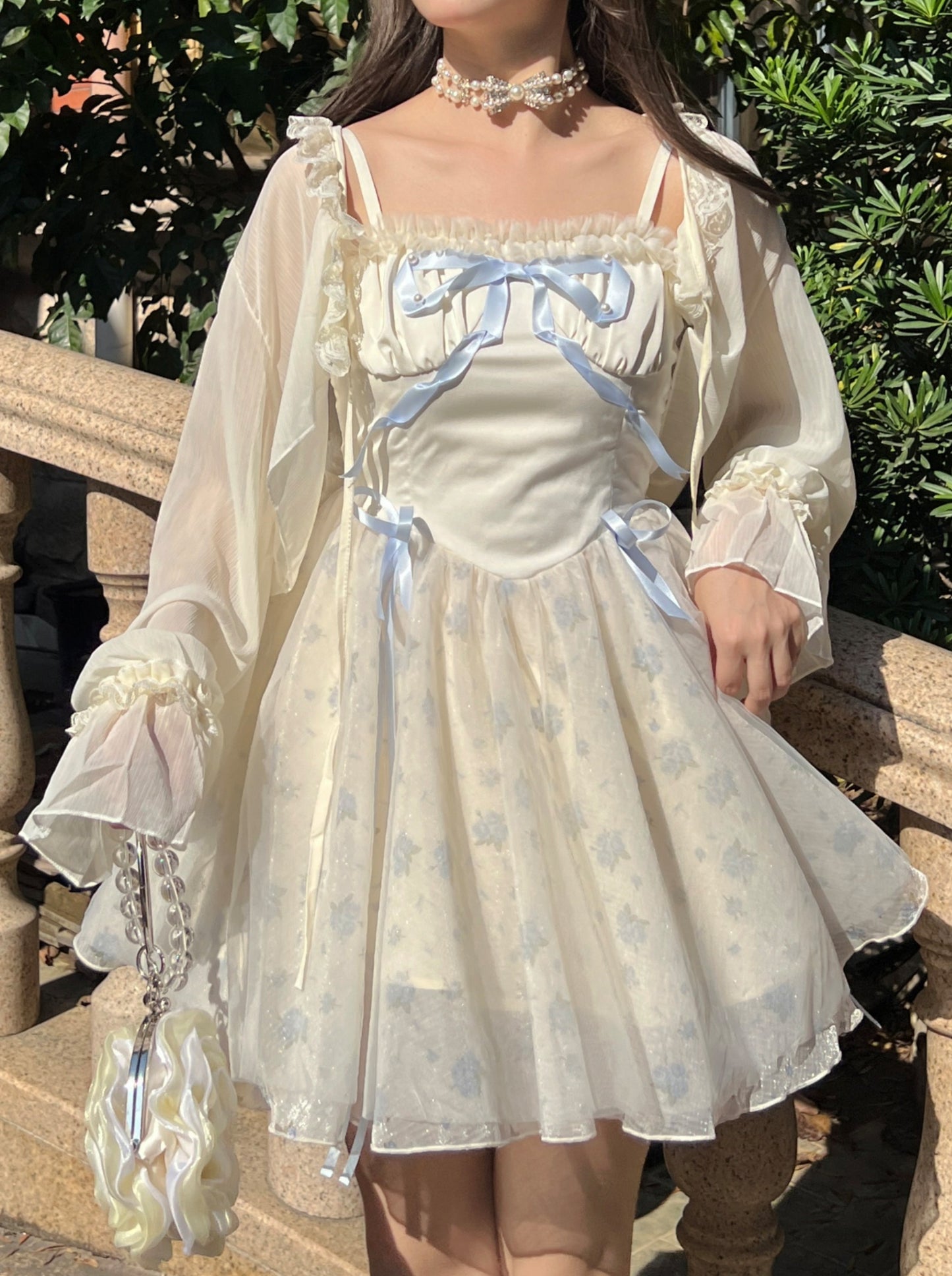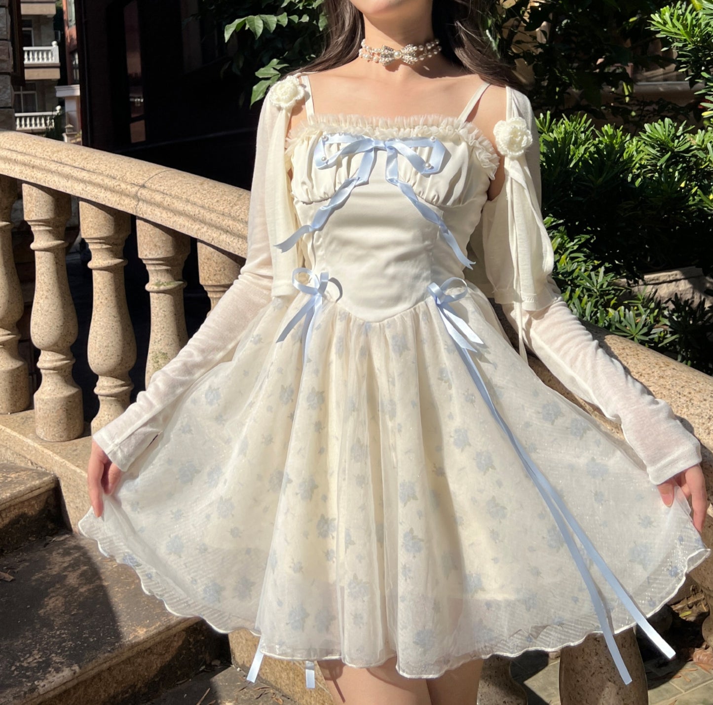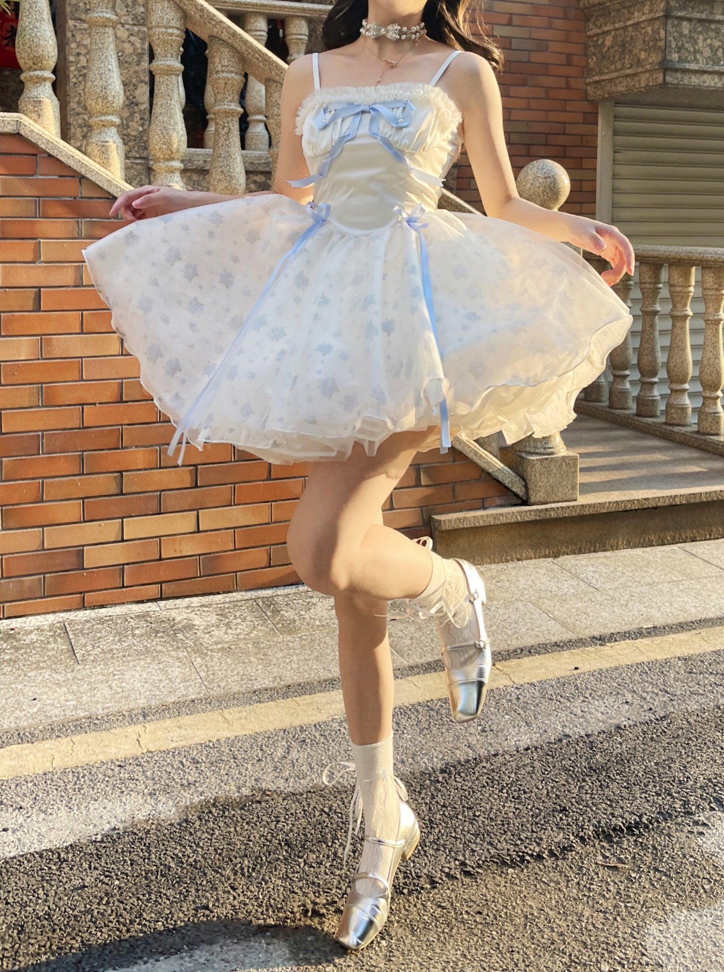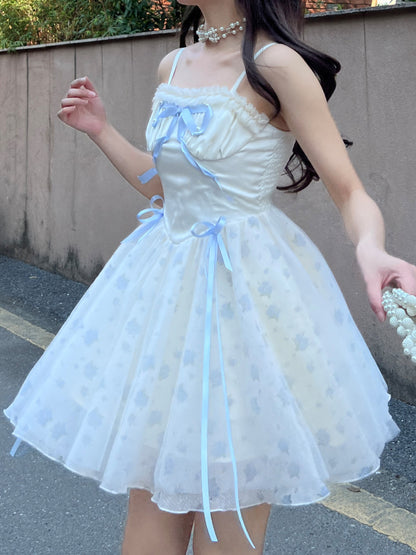 Ruellia Rococo Girl Blue Floral White Strap Dress