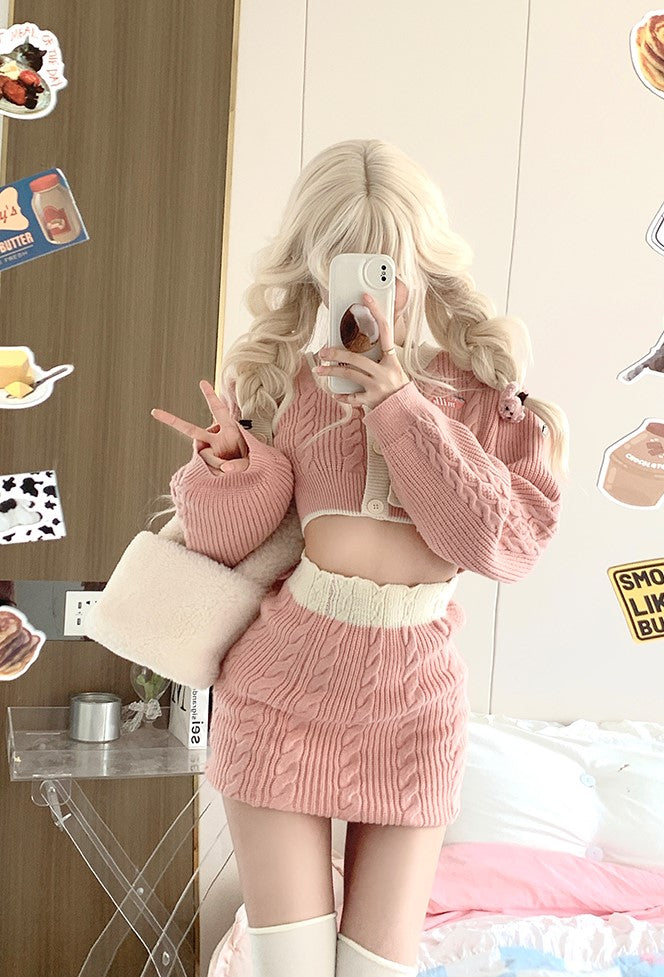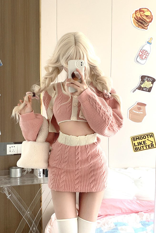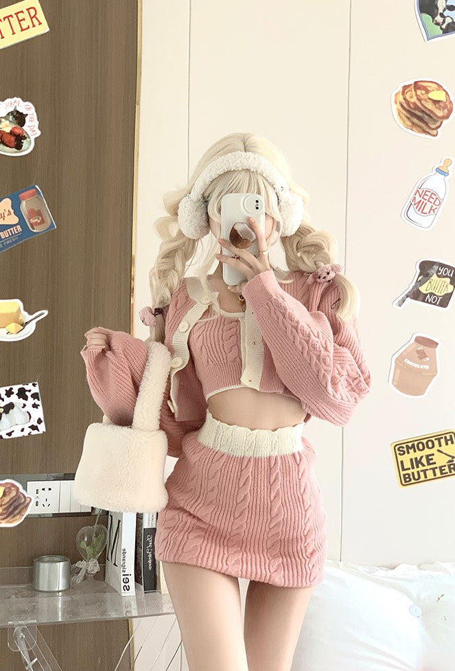 Serendipity Autumn Peach Pink Knit Camisole & Cardigan & Skirt Three Piece Set