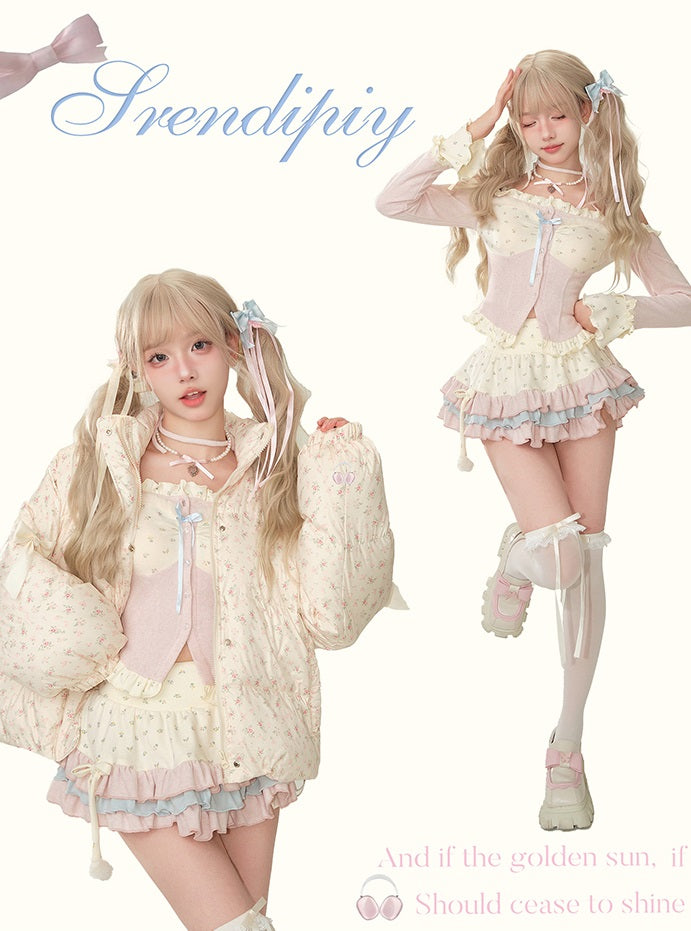 Serendipity Coquette Floral Patchwork Pink Shirt Top & Ruffled Cake Skirt Two Piece Set