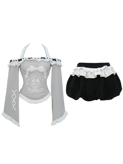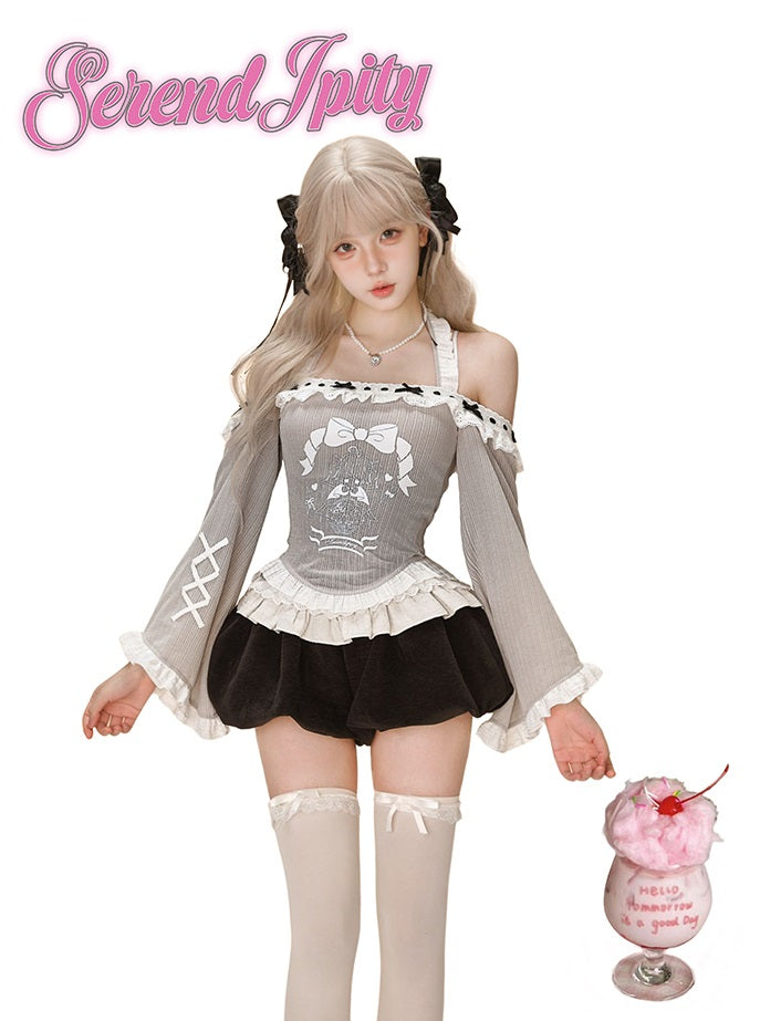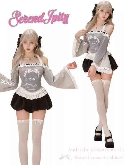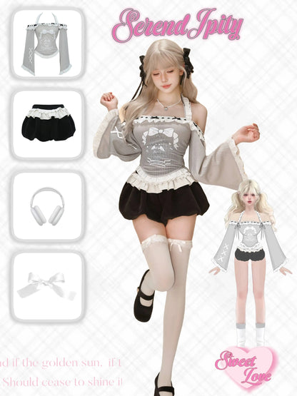 Serendipity Sugar Bobo Gray Top & Black Velvet Shorts Two Piece Set