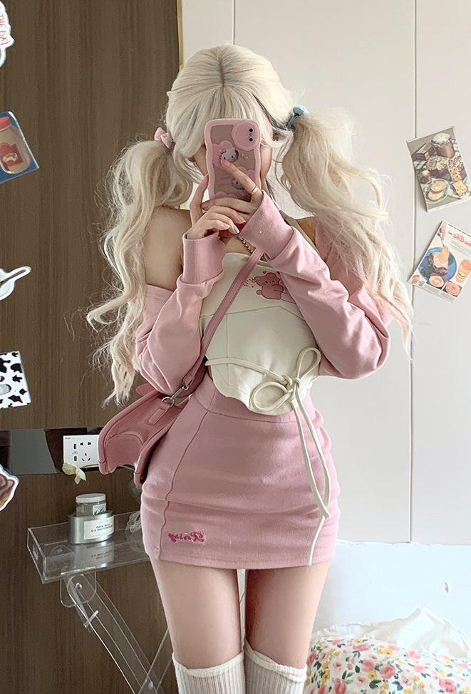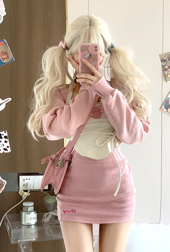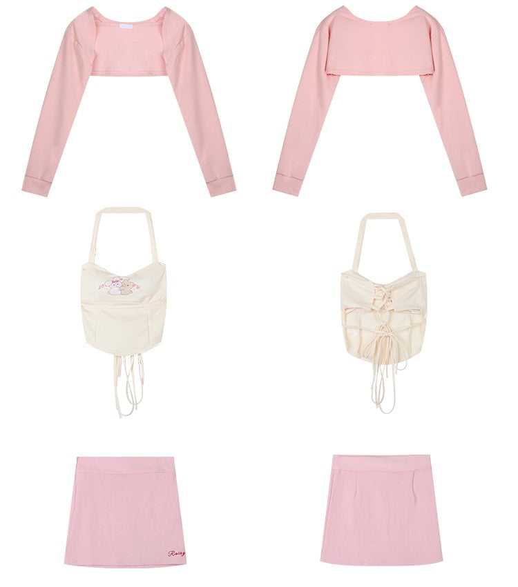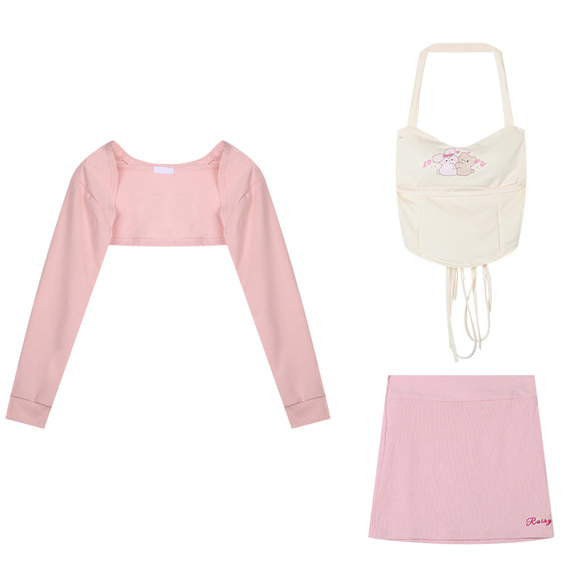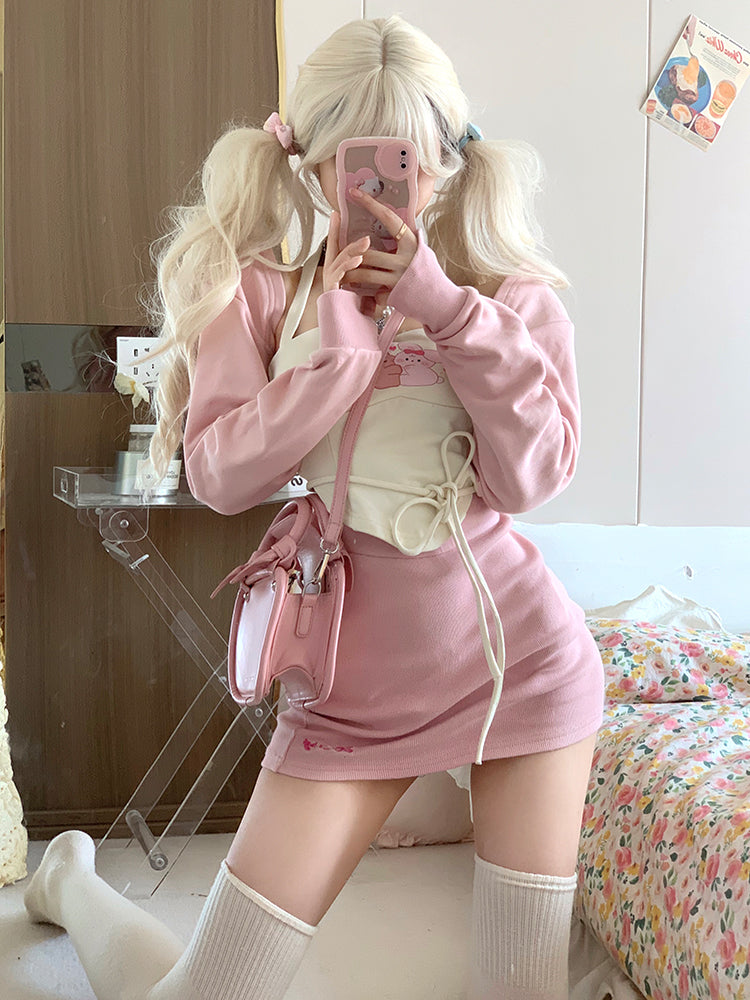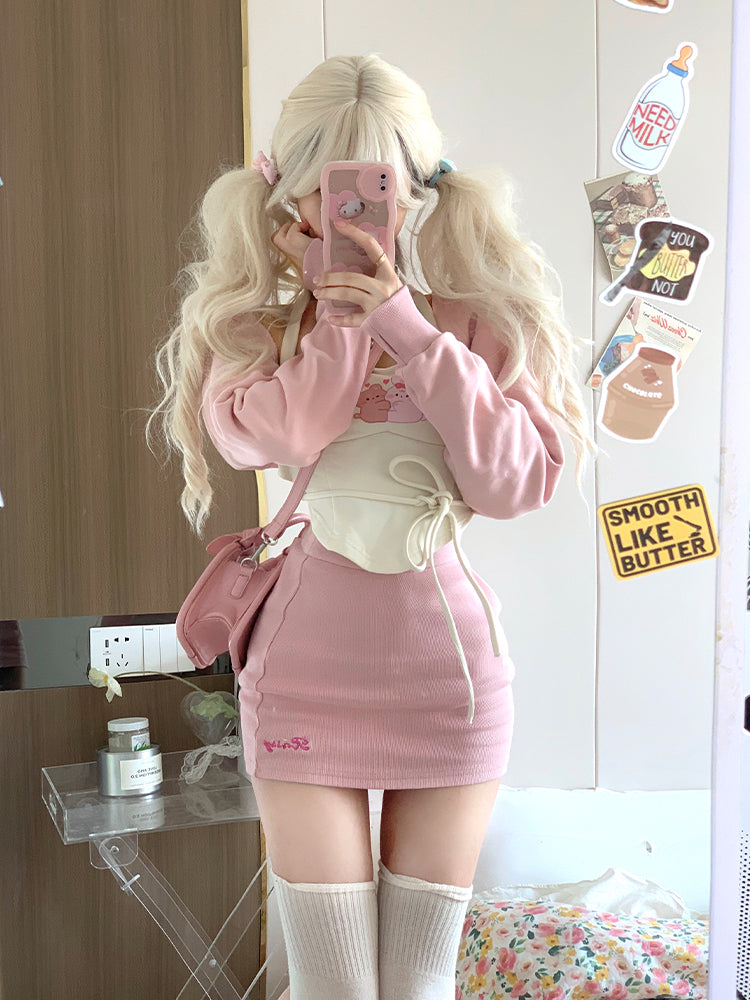 Serendipity Sweet Cream Rabbit Bear Camisole & Little Pink Jacket & Pink Mini Skirt Three Piece Set