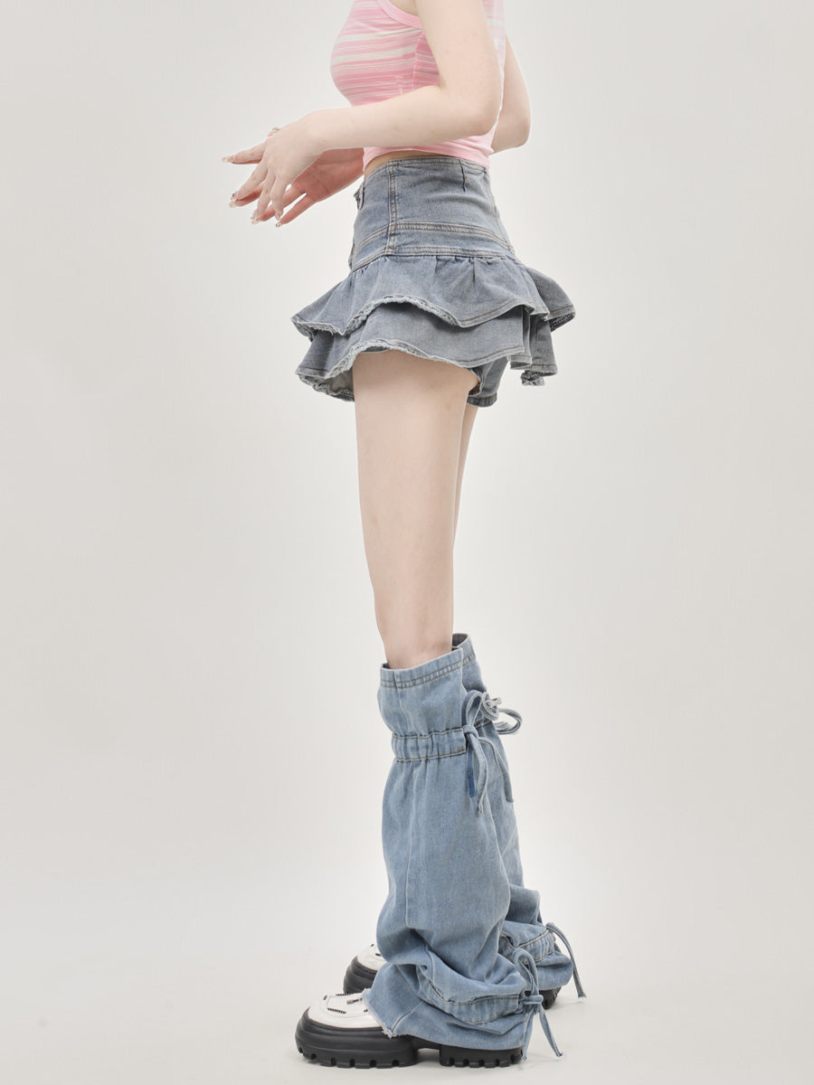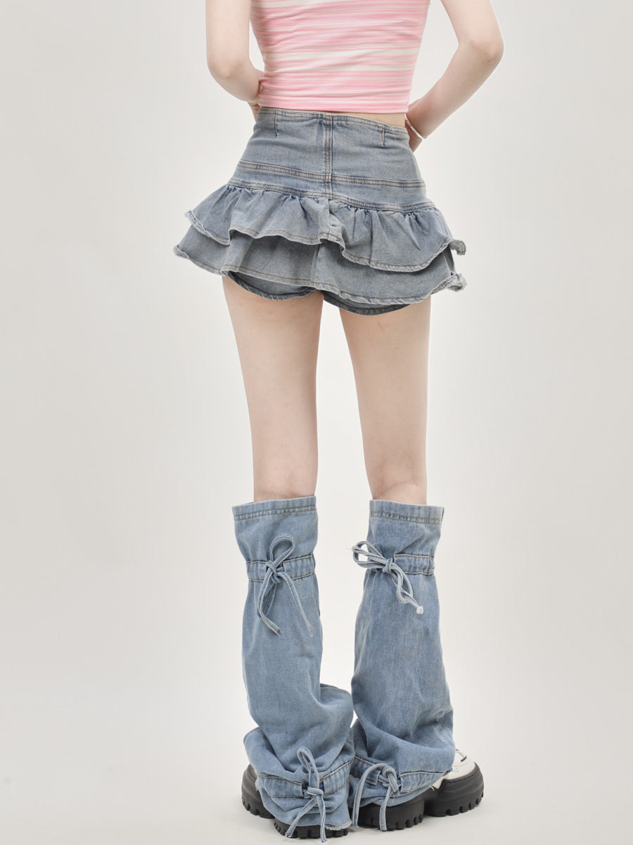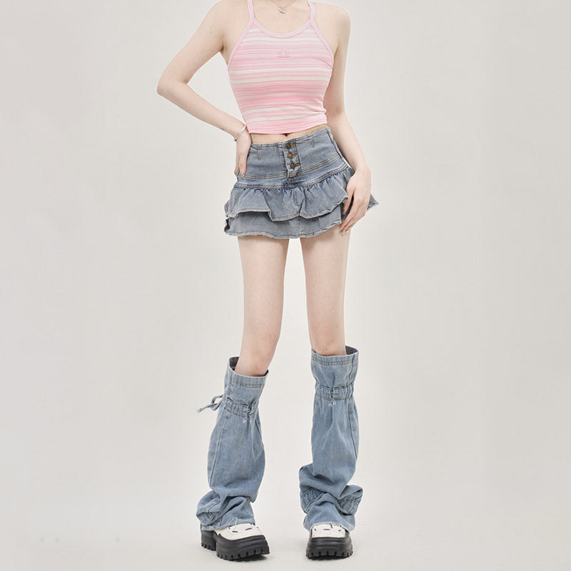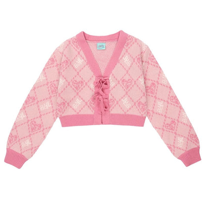 Y2K Jacquard Argyle Pink Blue Knit Cardigan & Denim Skirt & Leg warmers Three Piece Set