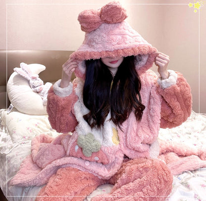 Strawberry Pink Thick Winter Pajamas Hooded Bathrobe & Pants Set