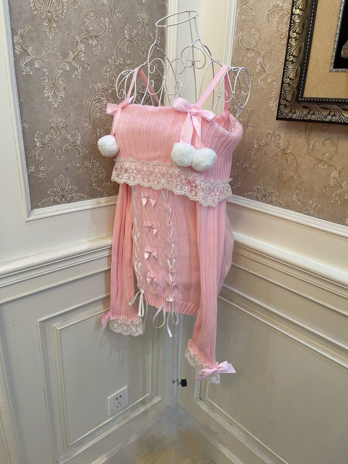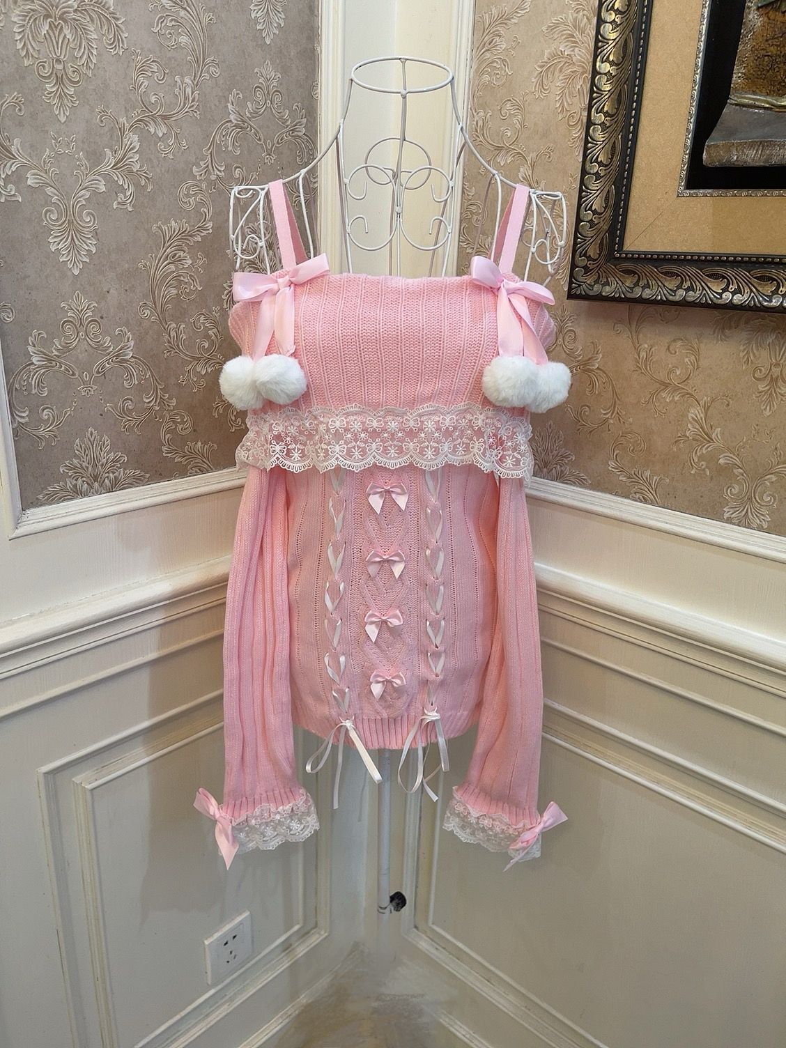 Sweetheart Princess Pompom Balls Pink Off Shoulder Sweater & White Ruffled Skirt Two Piece Set