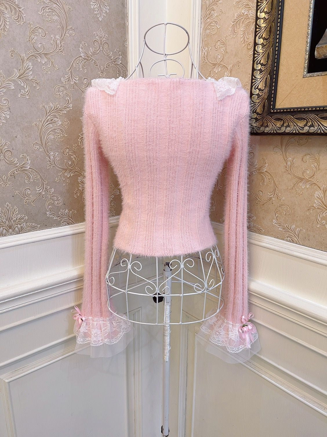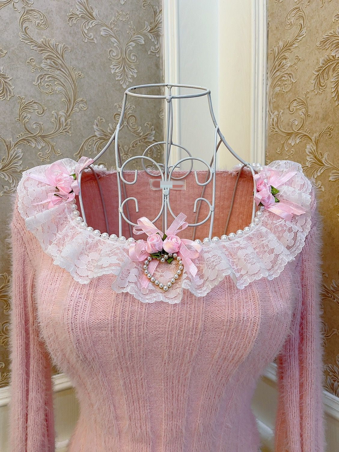 Sweetheart Princess Rose Lace Pink Knit Sweater & Mini Skirt Two Piece Set