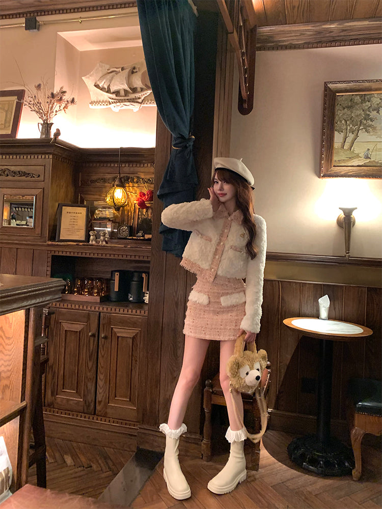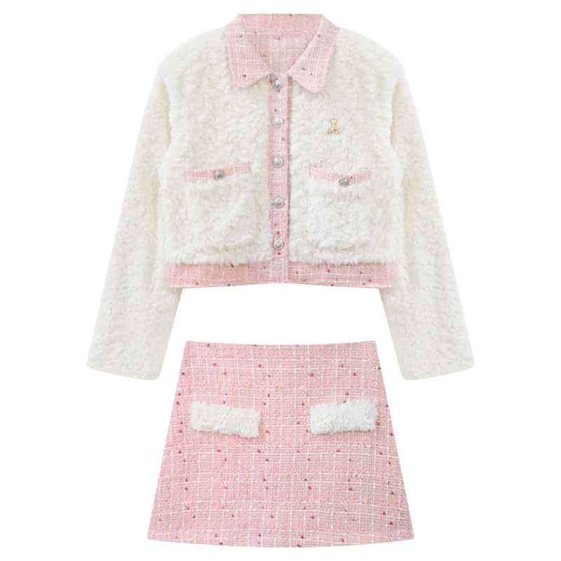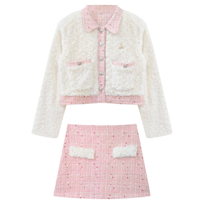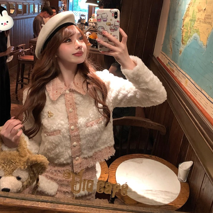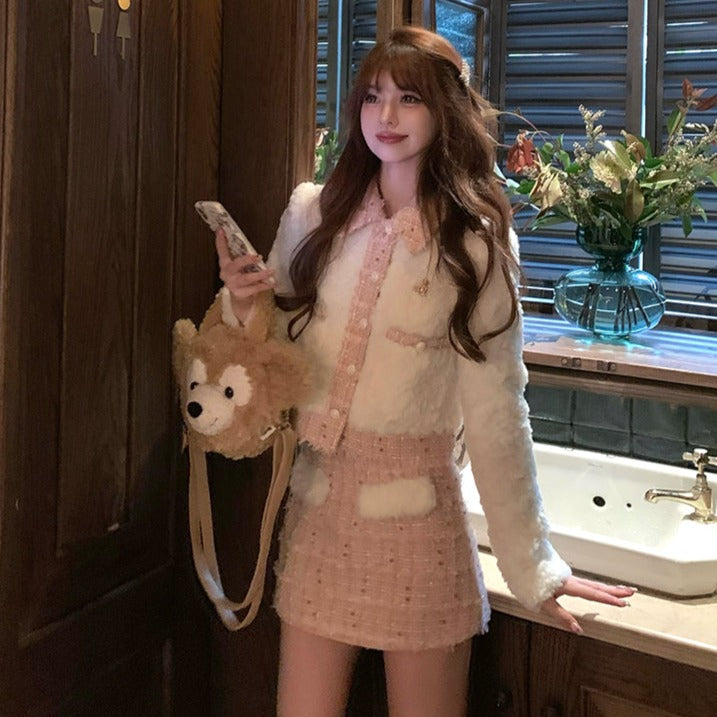 Lazy Girl Winter Elegant Lady Chic Plush White Jacket & Pink Tweed Skirt Two Piece Set