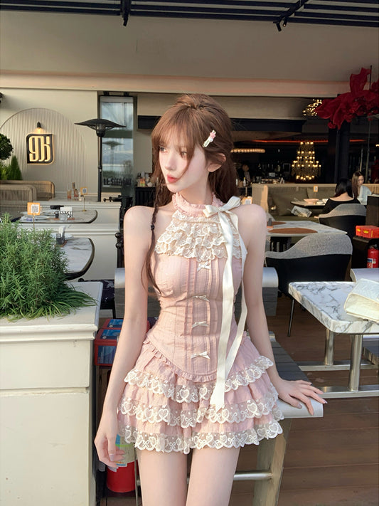 Serendipity Snow Romance Pink Sweater Coat Skirt Three Piece Set