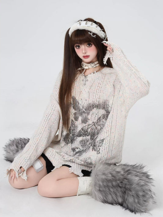 Crazy Girl Retro Wasteland Butterfly Pink White Knit Sweater