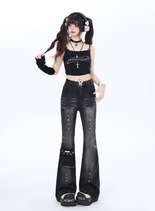 Crazy Girl Retro Black Gray Denim Flared Jeans