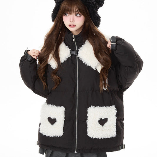 Crazy Girl Plush Collar Love Heart Winter Pink Black Puffer Jacket