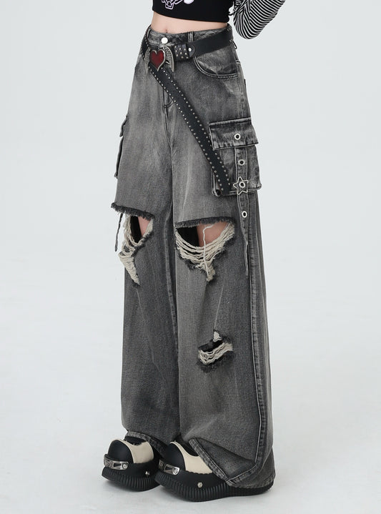 Crazy Girl Retro Gray Wide Leg Denim Ripped Jeans