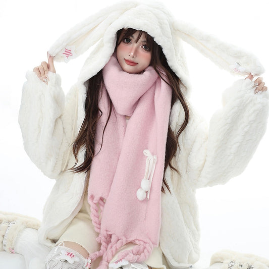 Crazy Girl Troubled Cat Pink White Thick Plush Hooded Jacket