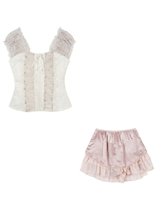 Creamy Cute Angel Lace Pale Pink Puff Sleeve Top & Ruffled Short Skirt Two Piece Set