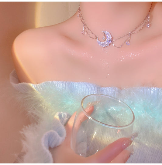 Crescent Moon Silver Luxury Pretty Girl Angelic Diamond Chain Tassel Pendant Necklace