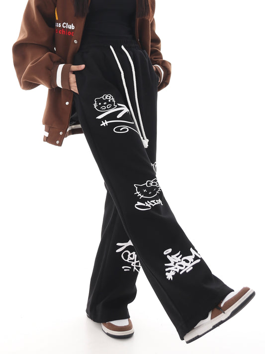 Graffiti Cartoon Kitty Cat White Black Red Cotton Sweatpants Pants