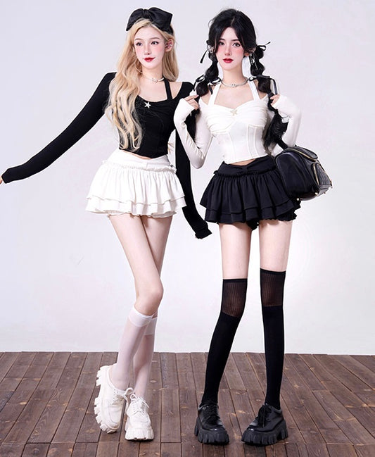 Kiki Coquette Ruffled Black Bow Halter Neck Off Shoulder Top Shirt