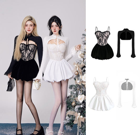 Kiki Lace Sexy Black White Strap Velvet Dress & Cardigan Two Piece Set