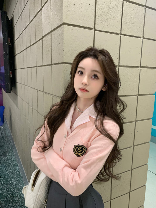 Lazy Girl Aussie School Girl Navy Blue & Pink Fake Two Piece Cardigan Top