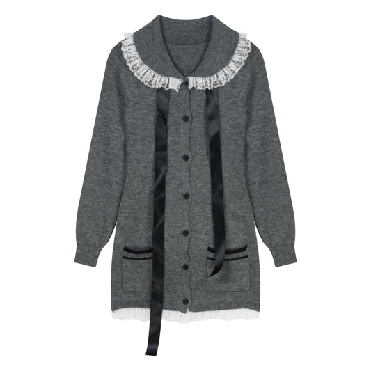 Lazy Girl Autumn Lace Collar Gray Black Knit Dress